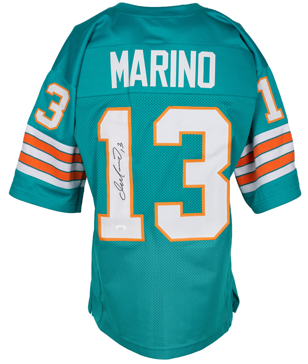 Custom on-field style jersey. Everything is sewn on, size XL. Hand-signed by Dan Marino (HOF).