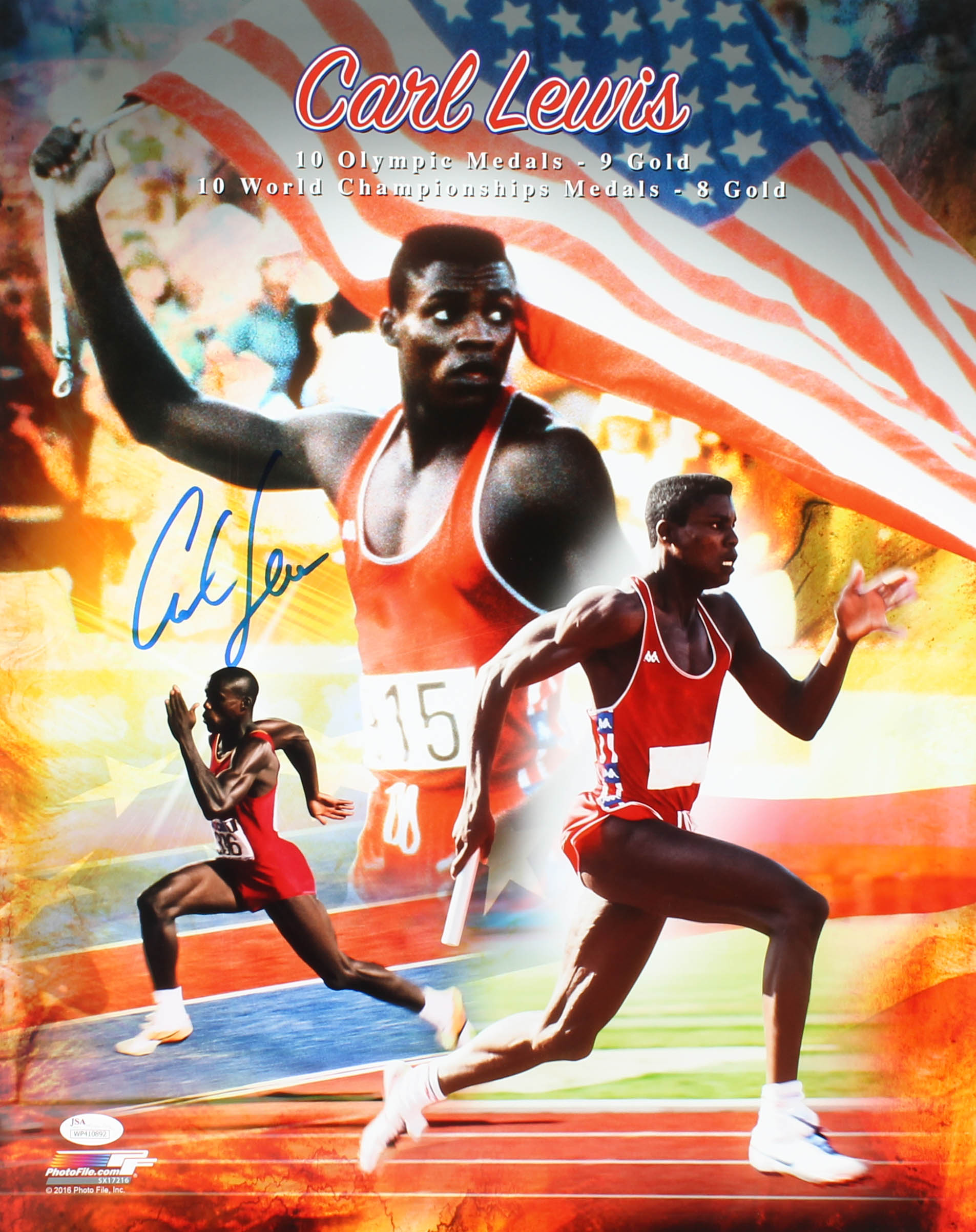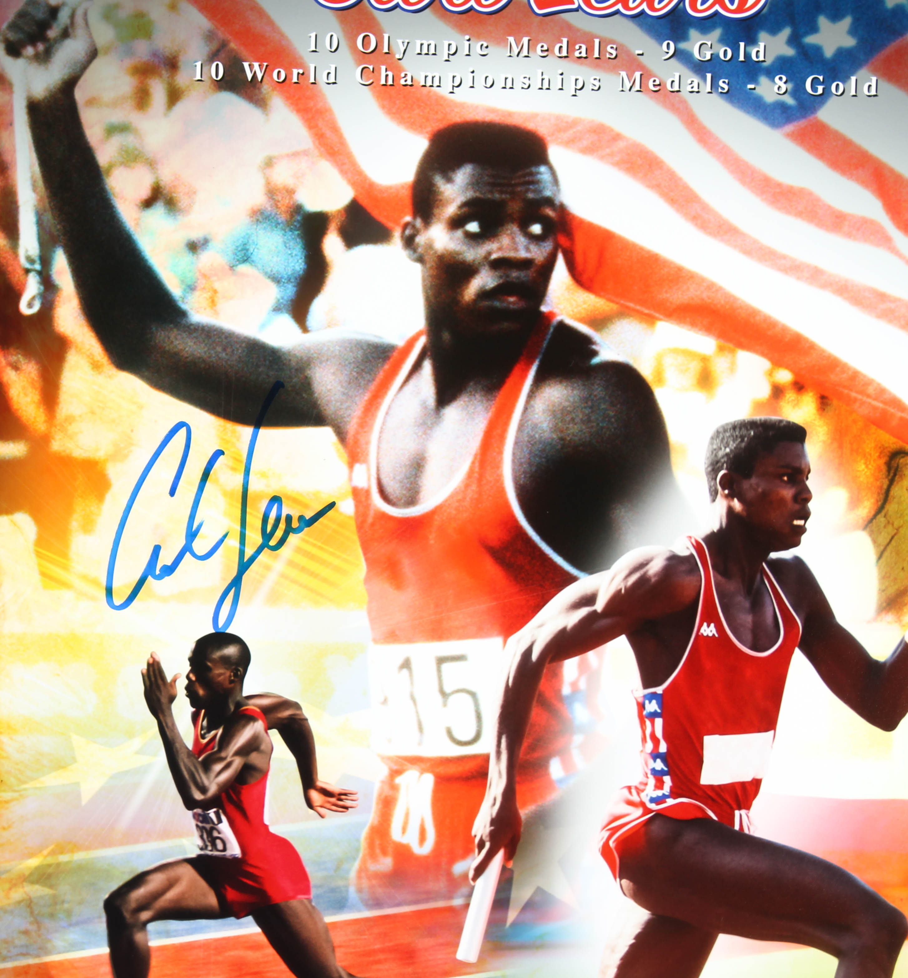 Photo measures 16" x 20" in size and has been hand-signed by Carl Lewis.