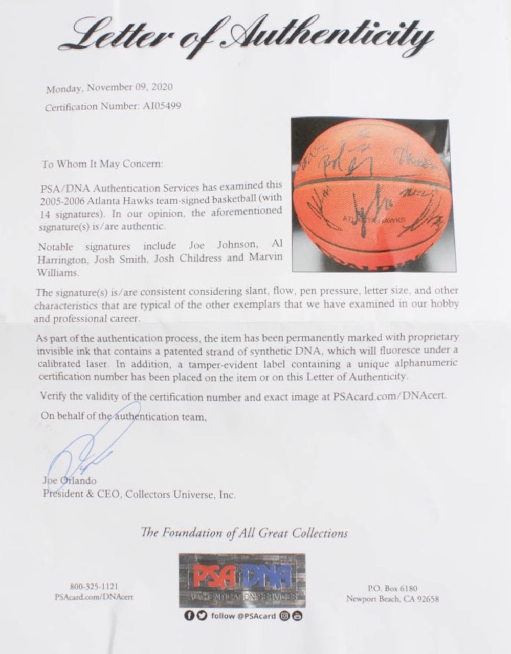 Spalding Official NBA Game Ball has been hand-signed by Joe Johnson, Josh Smith, Al Harrington, Marvin Williams, Josh Childress, Zaza Pachulia, Greg Ballard, and 7 others. Please see photos for details regarding the condition of the ball.