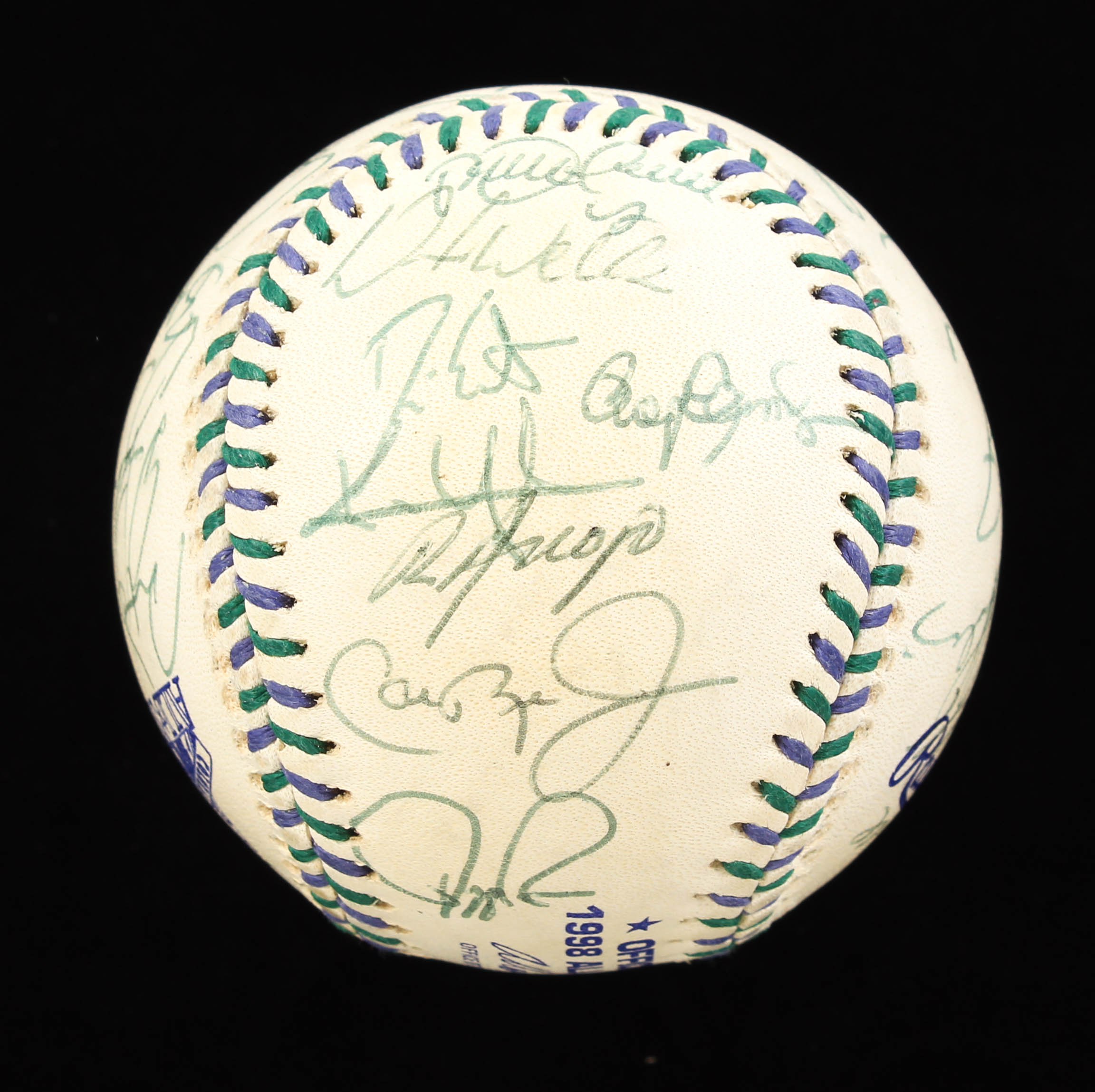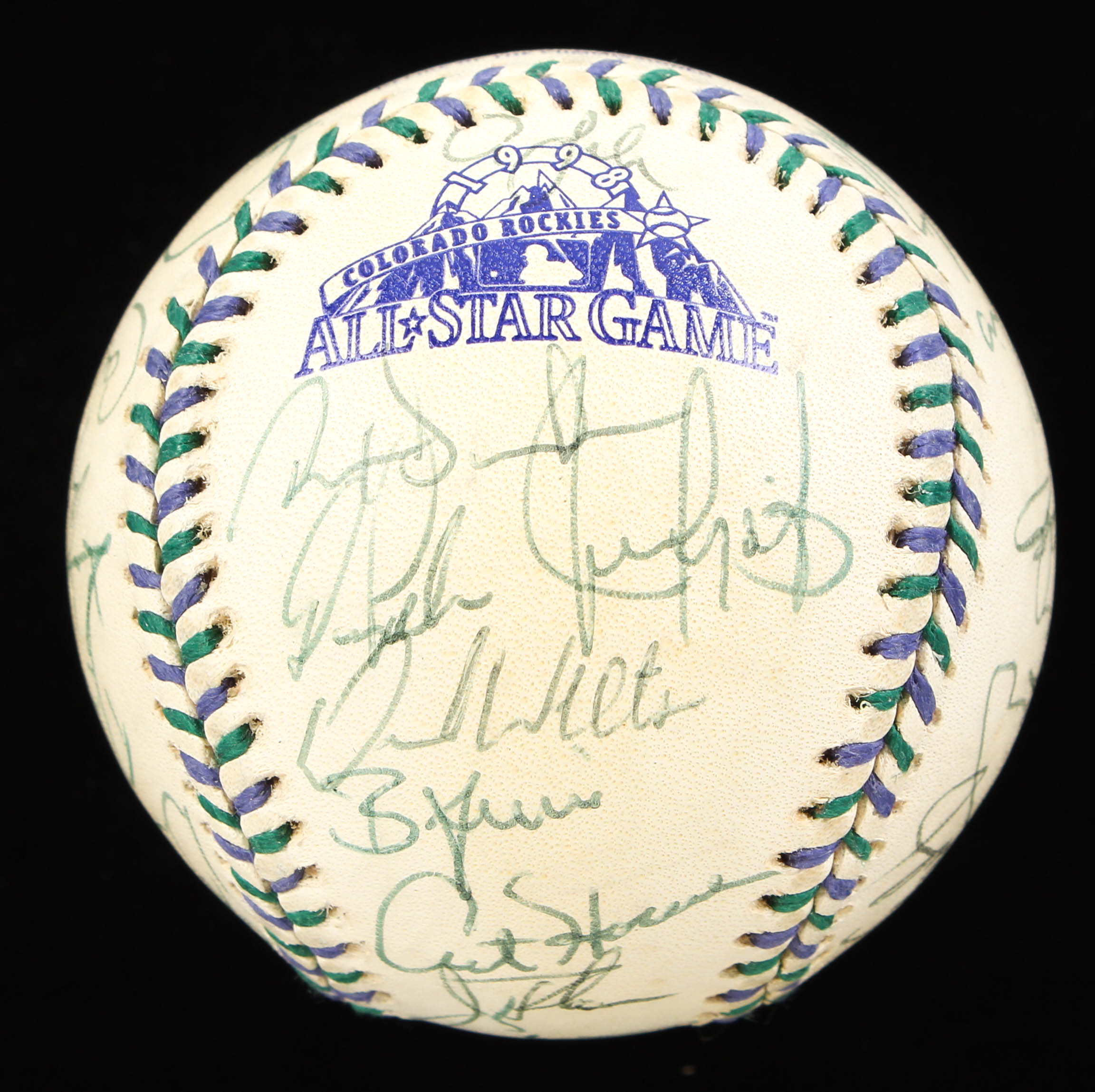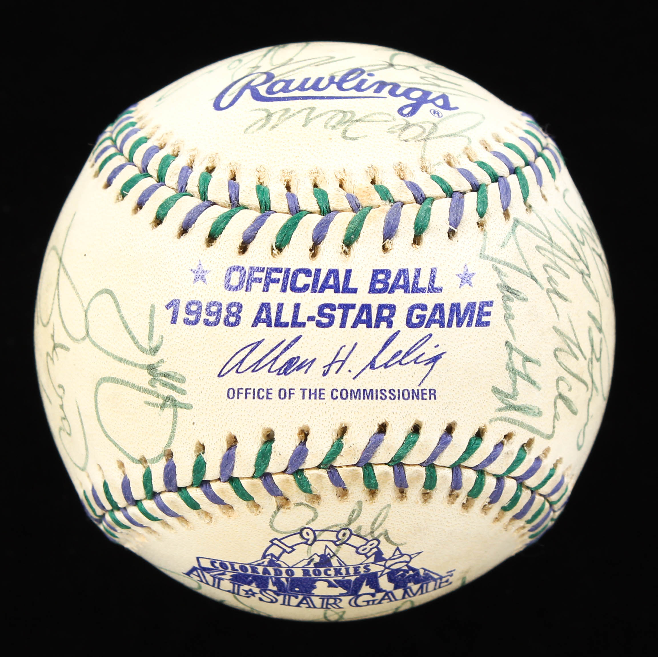 Rawlings Official 1998 All-Star Game baseball. Hand-signed by (32) with Bartolo Colon, David Wells (Signed Twice), Roger Clemens, Rafael Palmeiro, Paul O'Neill, Alex Rodriguez, Kenny Lofton, Juan Gonzalez, and Hall of Fame inductees Joe Torre, Cal Ripken Jr., Jim Thome, Derek Jeter, Ken Griffey Jr. and Roberto Alomar.