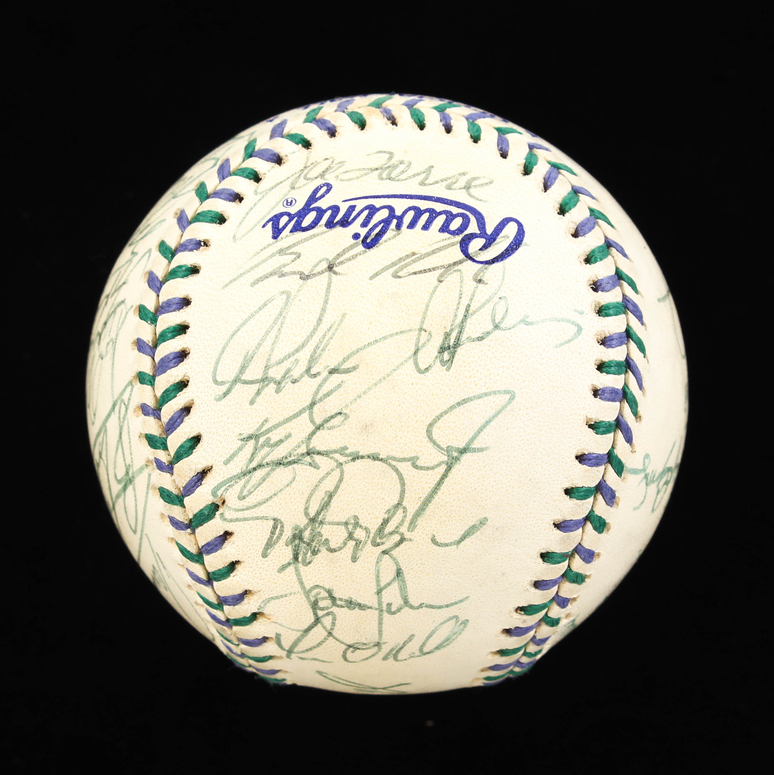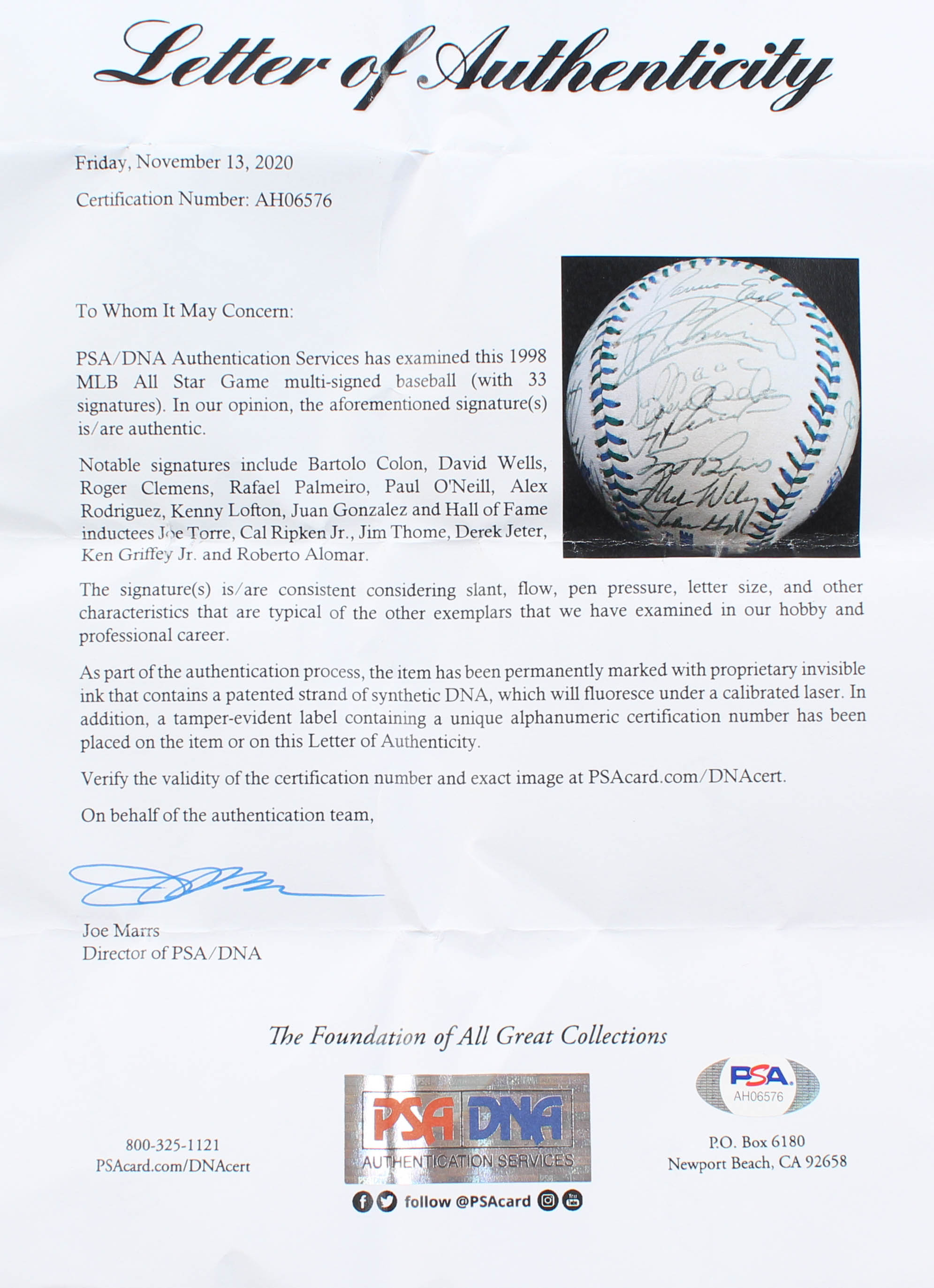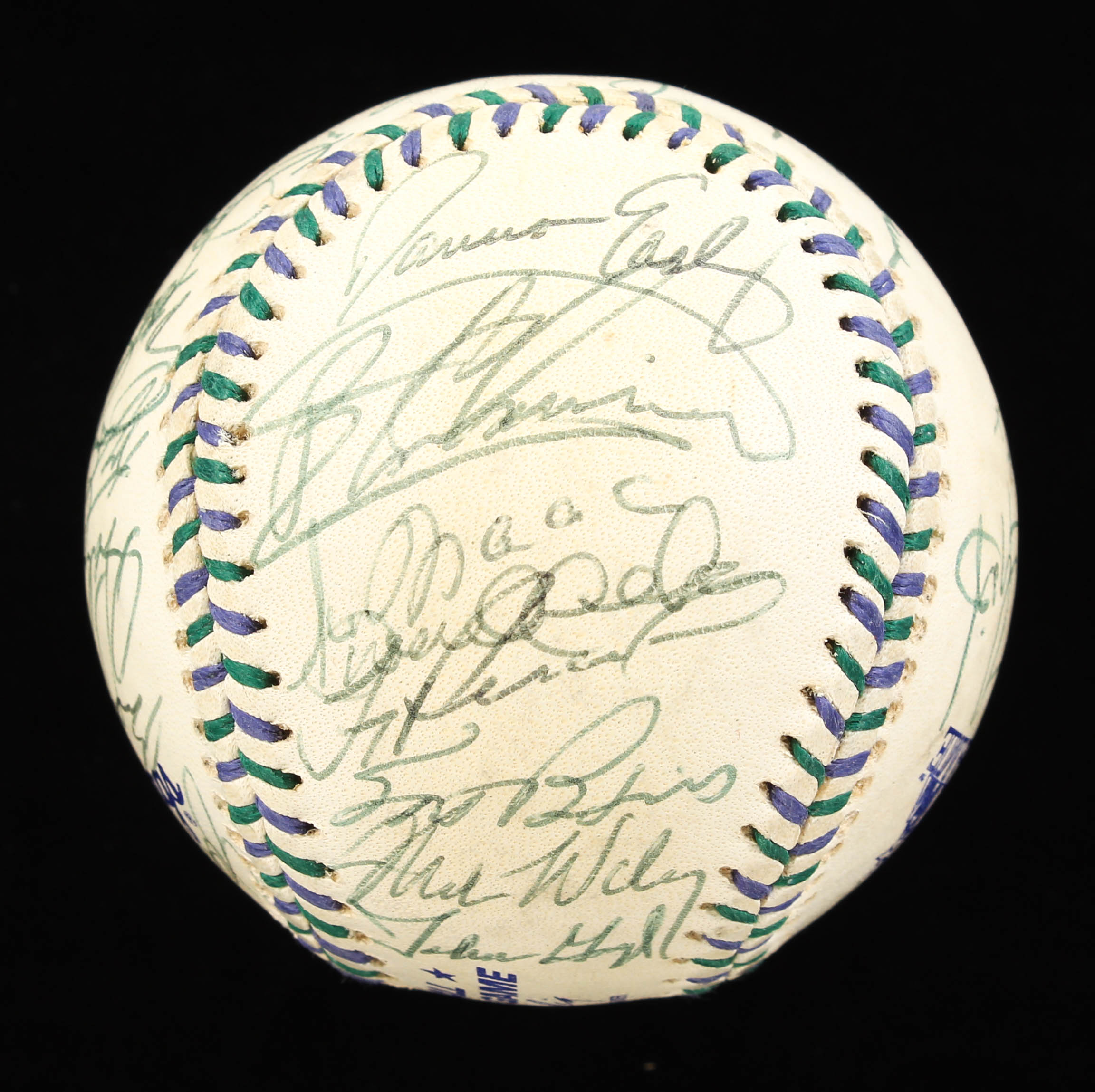 Rawlings Official 1998 All-Star Game baseball. Hand-signed by (32) with Bartolo Colon, David Wells (Signed Twice), Roger Clemens, Rafael Palmeiro, Paul O'Neill, Alex Rodriguez, Kenny Lofton, Juan Gonzalez, and Hall of Fame inductees Joe Torre, Cal Ripken Jr., Jim Thome, Derek Jeter, Ken Griffey Jr. and Roberto Alomar.