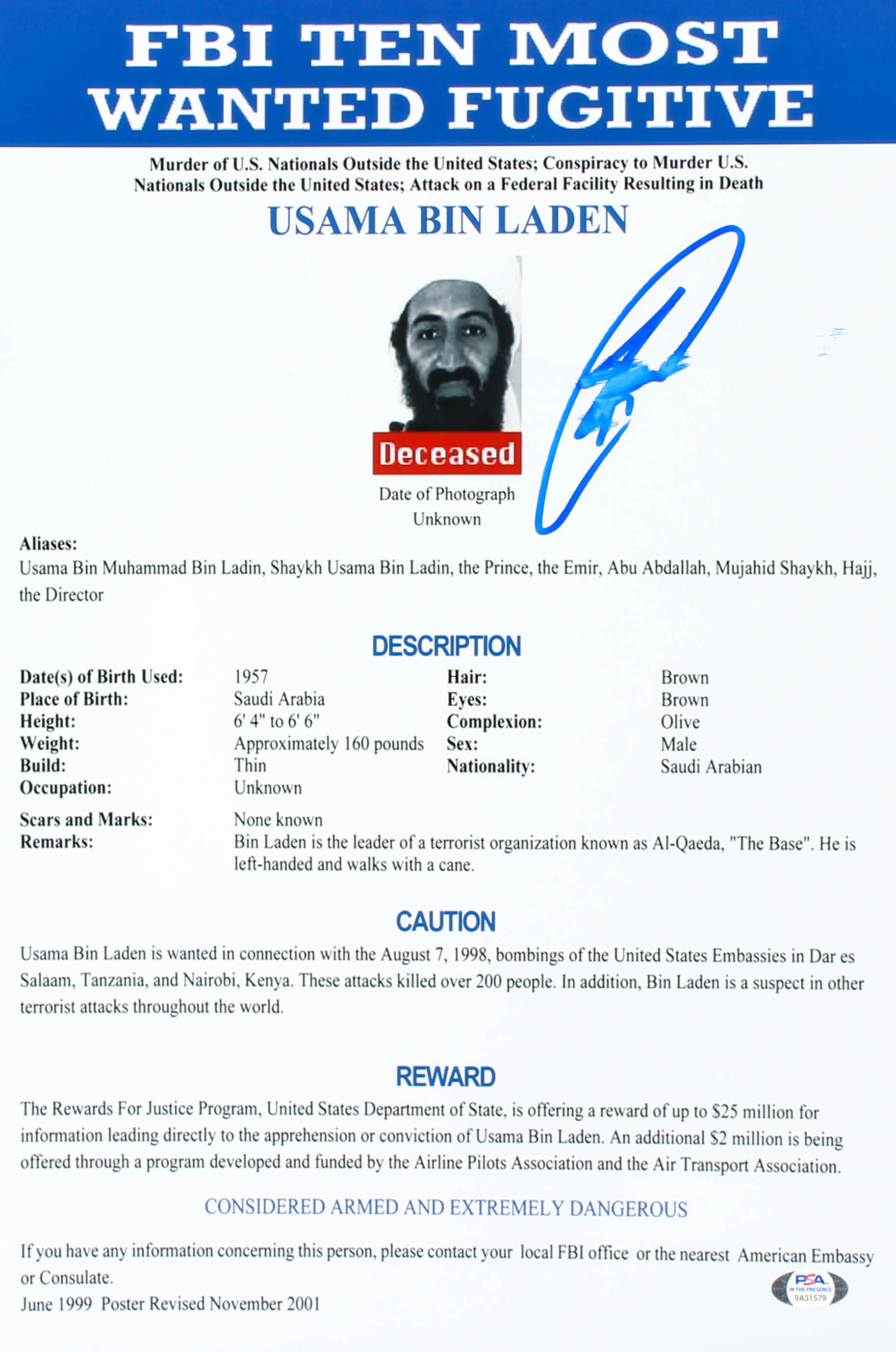 Robert J. O'Neill Signed FBI Most Wanted 12x18 Photo (PSA COA)