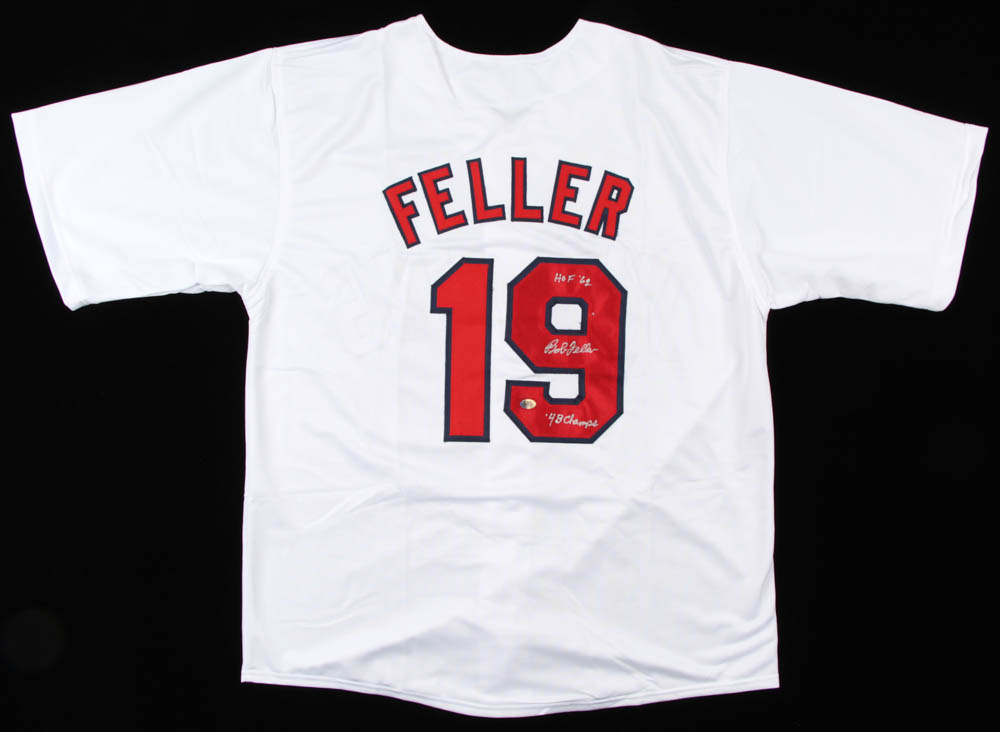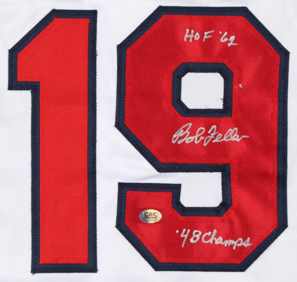 Bob Feller Signed Jersey Inscribed "HOF 62" & "48 Champs" (CAS COA)