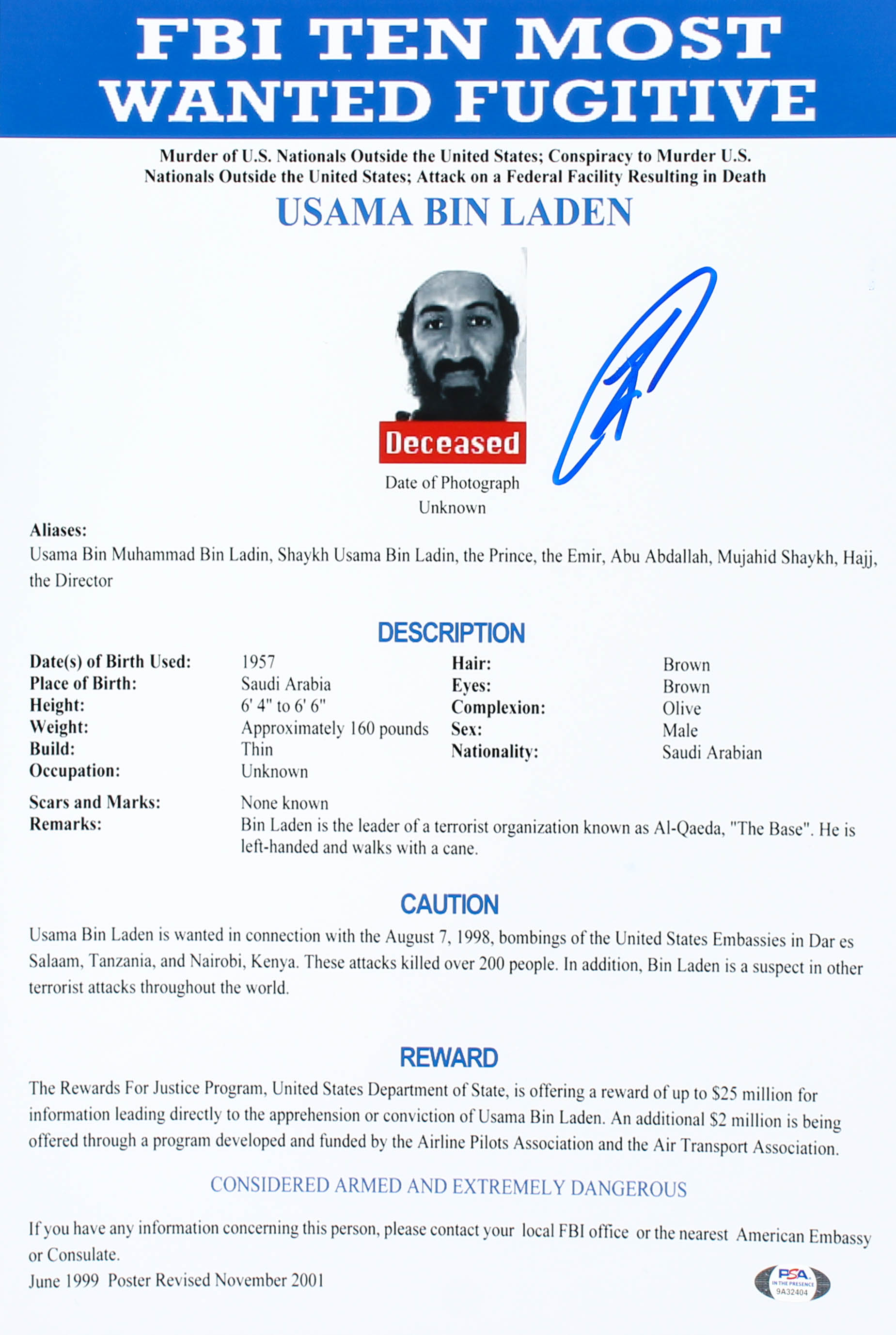 Robert J. O'Neill Signed FBI Most Wanted 12x18 Photo (PSA COA)