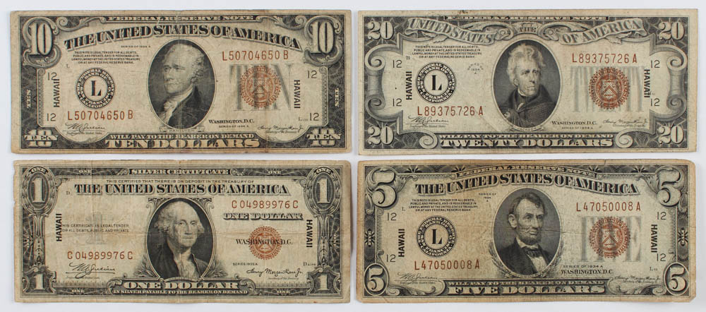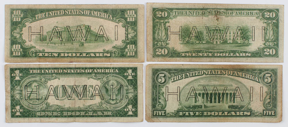 1934-1935 Hawaii Brown Seal WWII "Emergency Note" Set of (4) with $20, $10, $5, & $1