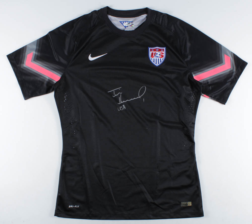 Nike on-field style jersey. Everything is sewn on, size XL. Hand-signed by Tim Howard.