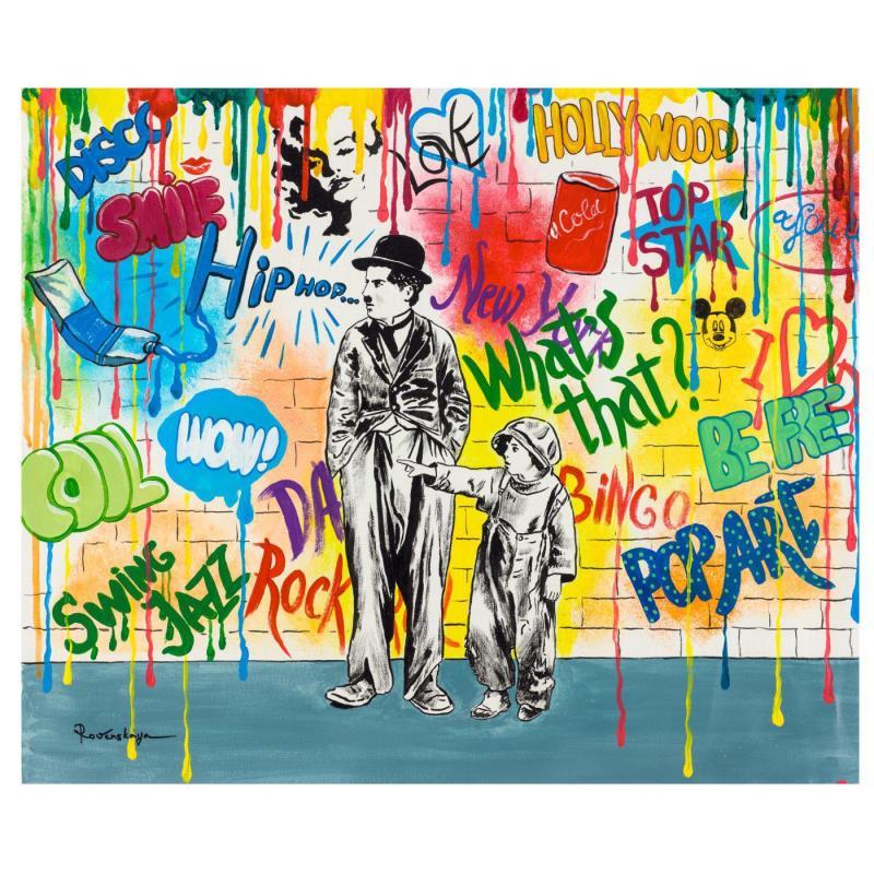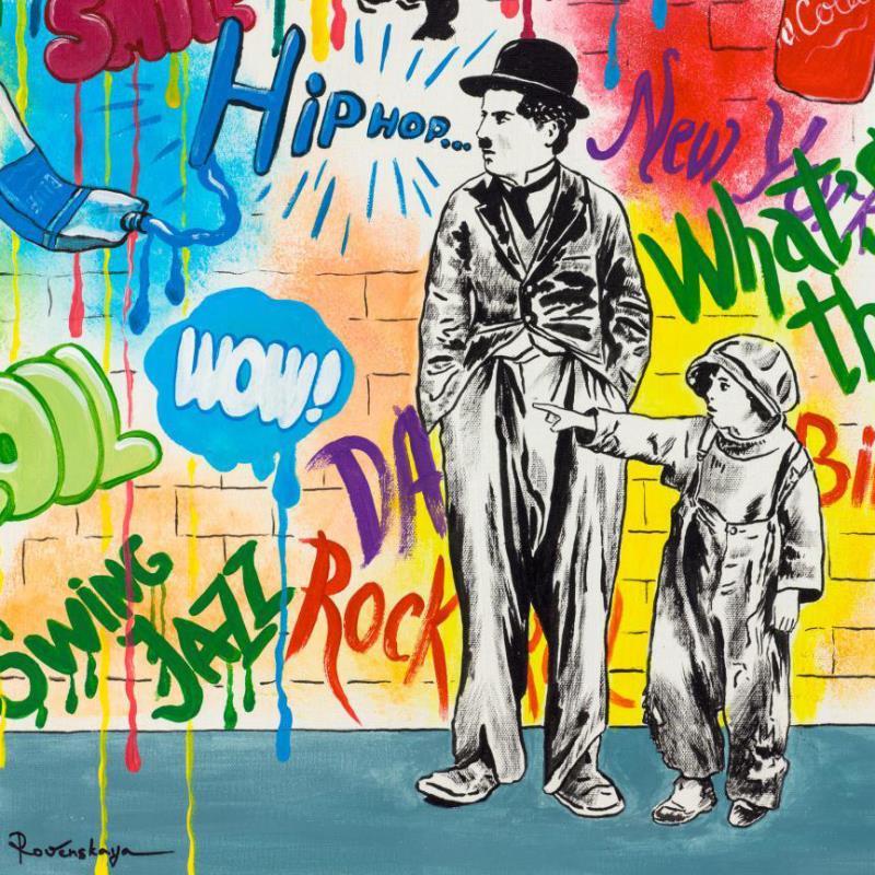"Wanna be like Chaplin" is an Original Paiting, Oil on Canvas, by Nastya Rovenskaya. The piece is hand signed by the artist and is accompanied by a certificate of authenticity. Measures approximately: 20" x 24".