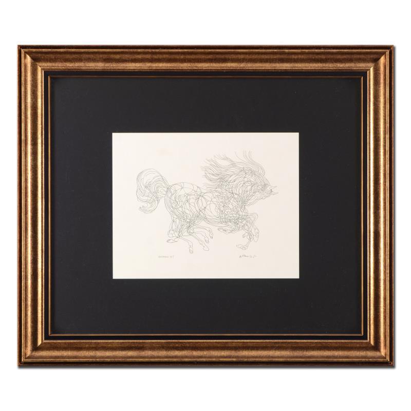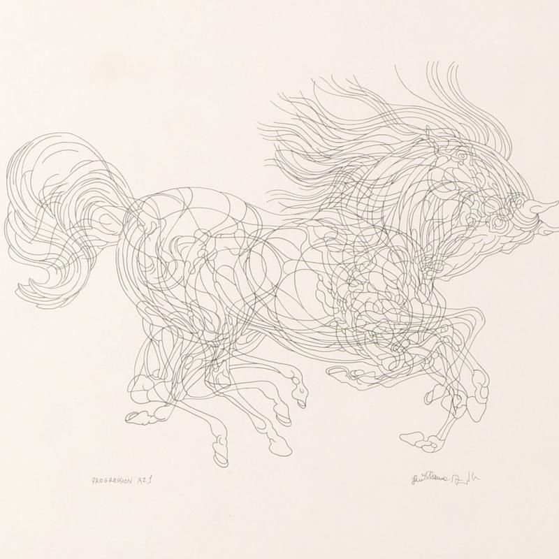 Horses, dancers and figures are treated as graphic landscapes. Hooves, heads, manes and limbs are so many hills and valleys. Shaded glades are evoked by the manipulation of parallel lines theatrically meandering, running close at times then separating to mimic the topography of some lost geography. His colors are the rainbow-like refraction of light after a downpour as they pick up the threads of his linear tale and weave them into a solid cloth.