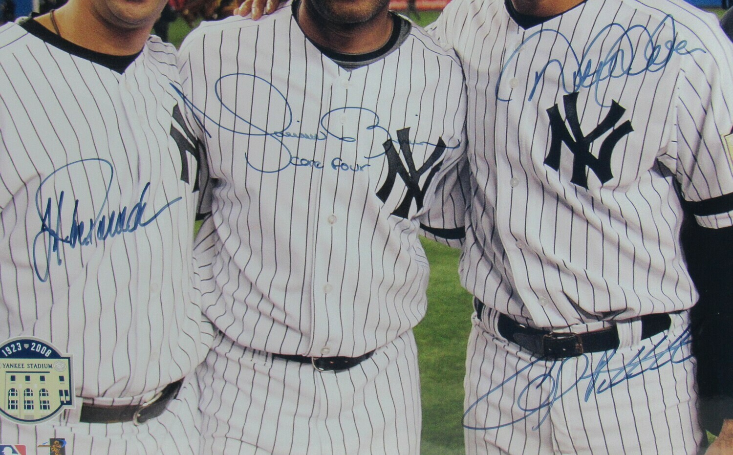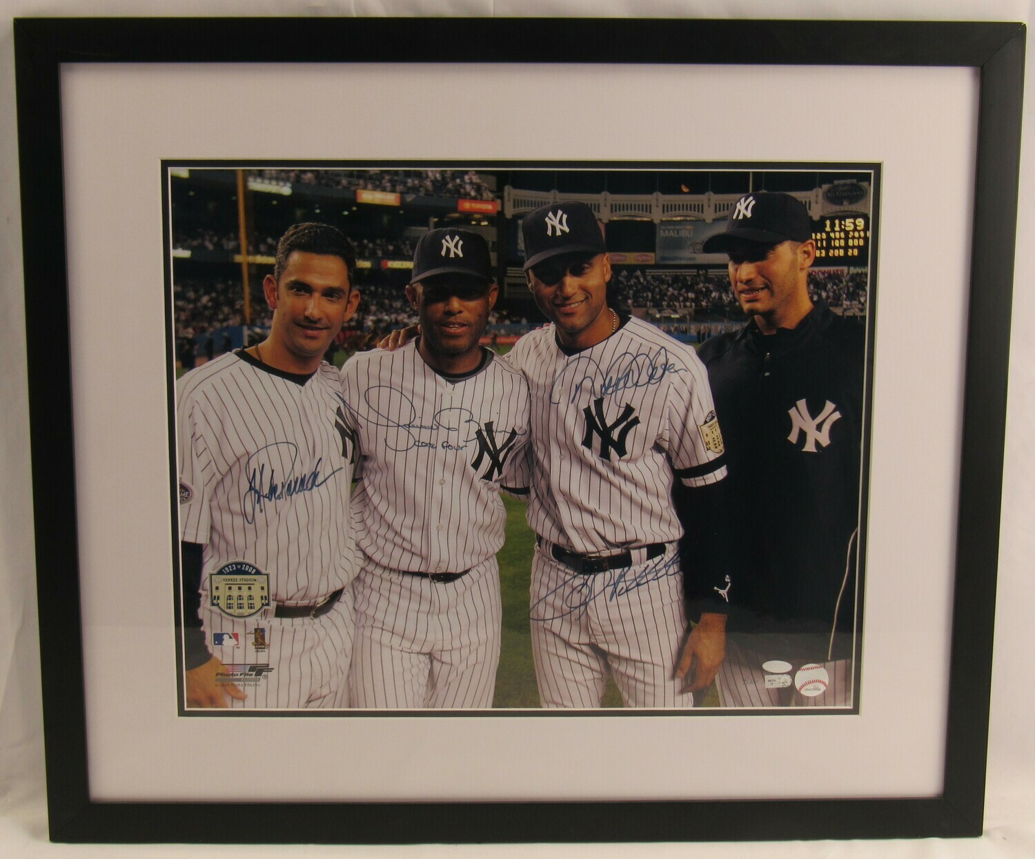 Custom framed photo measures 23" x 27" in size and has been hand-signed by Derek Jeter, Andy Pettitte, Jorge Posada, and Mariano Rivera (HOF).