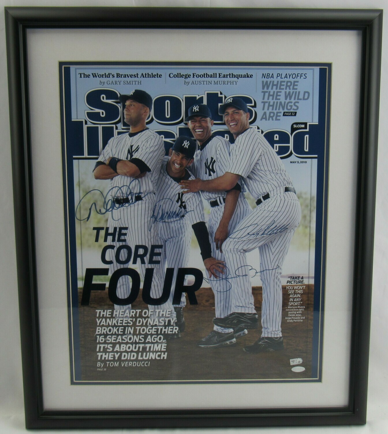 Custom framed photo measures 22" x 26" in size and has been hand-signed by Derek Jeter, Andy Pettitte, Jorge Posada, and Mariano Rivera (HOF). Together, Derek Jeter, Jorge Posada, Mariano Rivera, & Andy Pettitte set numerous Yankee & MLB Records, collecting 5 World Series Titles along the way.