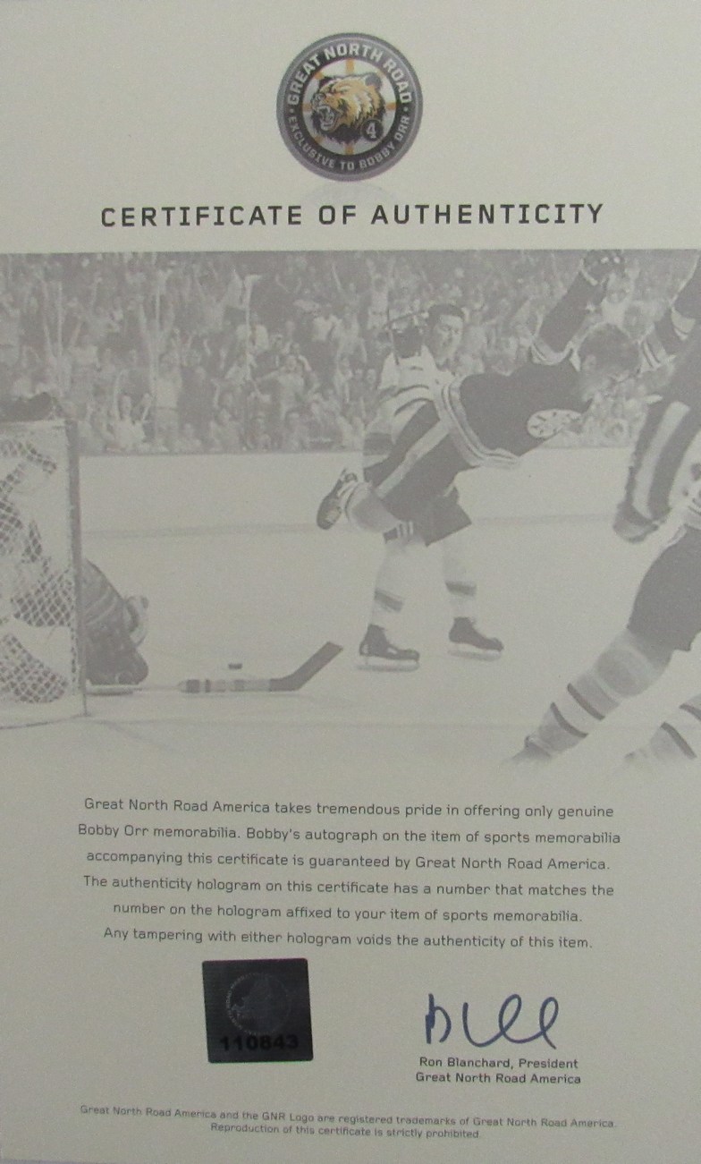 The autograph includes an official Bobby Orr hologram and matching COA from Great North Road for authenticity purposes.