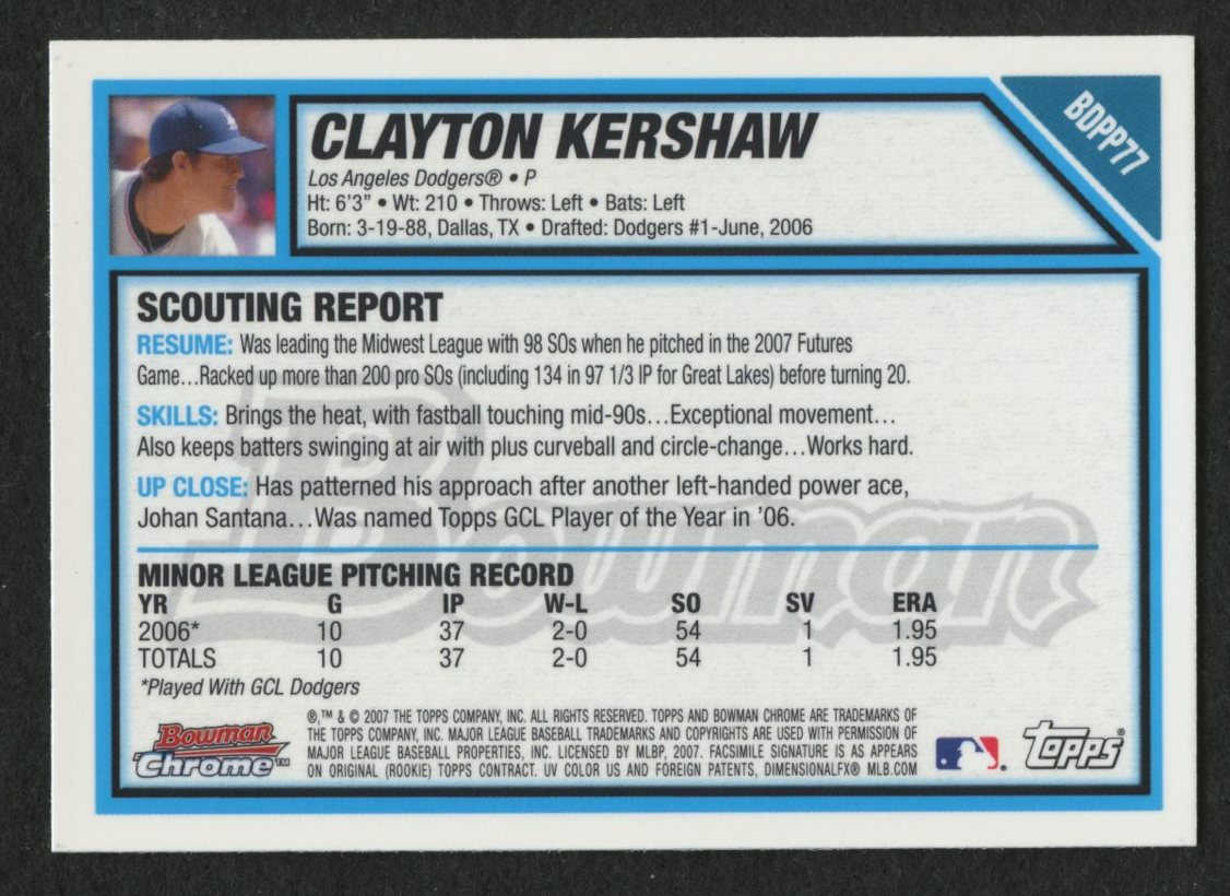 Clayton Kershaw 2007 Bowman Chrome Draft Future's Game Prospects #BDPP77