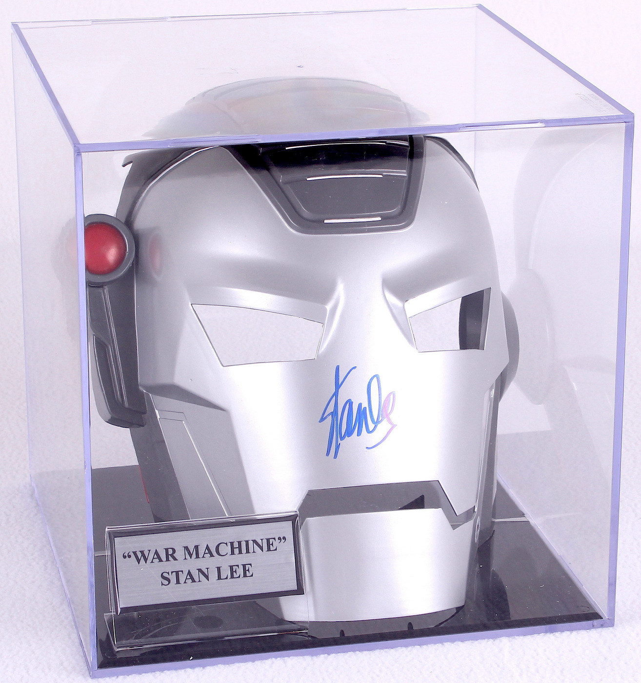 Official Marvel War Machine mask. Hand-signed in blue felt-tip pen by Stan Lee. The auction includes the display case shown in the photos. Also includes a 2" x 3.5" 'War Machine' plaque inside the case. The autograph includes an official PSA/DNA hologram and matching COA for authenticity purposes.