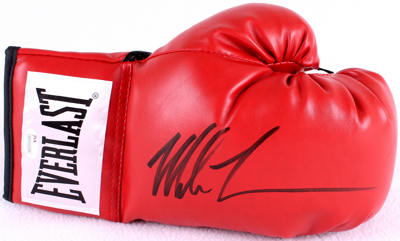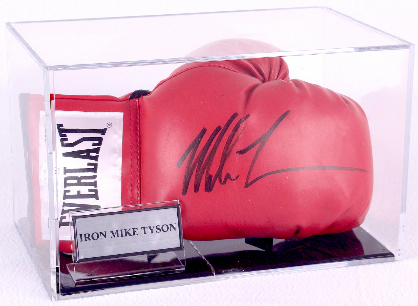 Everlast boxing glove. Hand-signed in black felt-tip pen by Mike Tyson. The glove comes in the display case as shown in the photos. Also includes a 2" x 3.5" plaque inside the case. The autograph includes an official James Spence Authentication (JSA) hologram and matching COA for authenticity purposes. The signing of this item was witnessed by JSA.