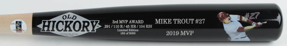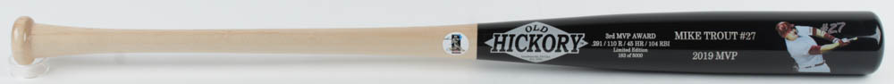 2019 MVP Old Hickory baseball bat. The bat is custom engraved with Trout's 2019 season statistics. The baseball bat is limited edition #183/5,000. Please note, the bat is unsigned.