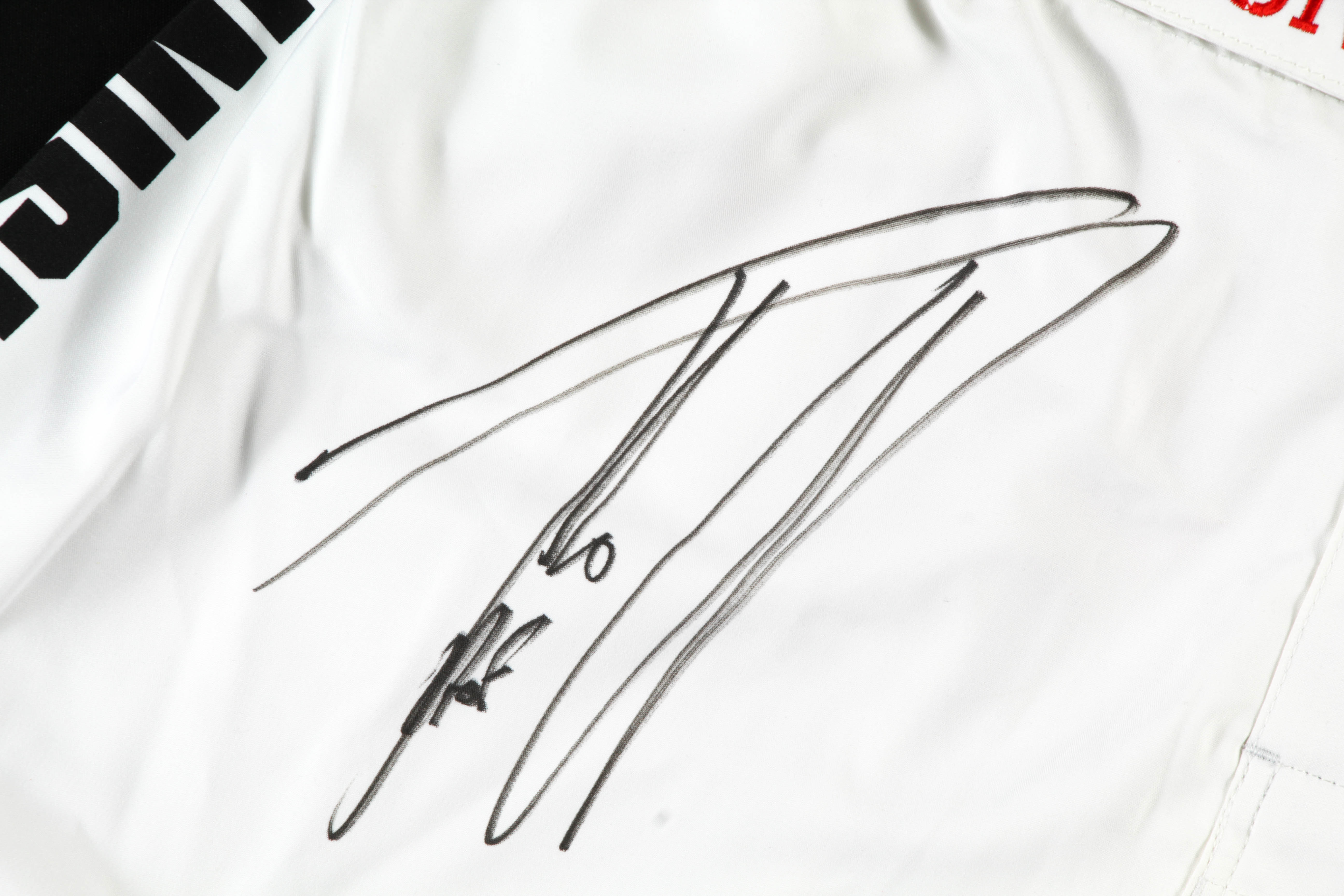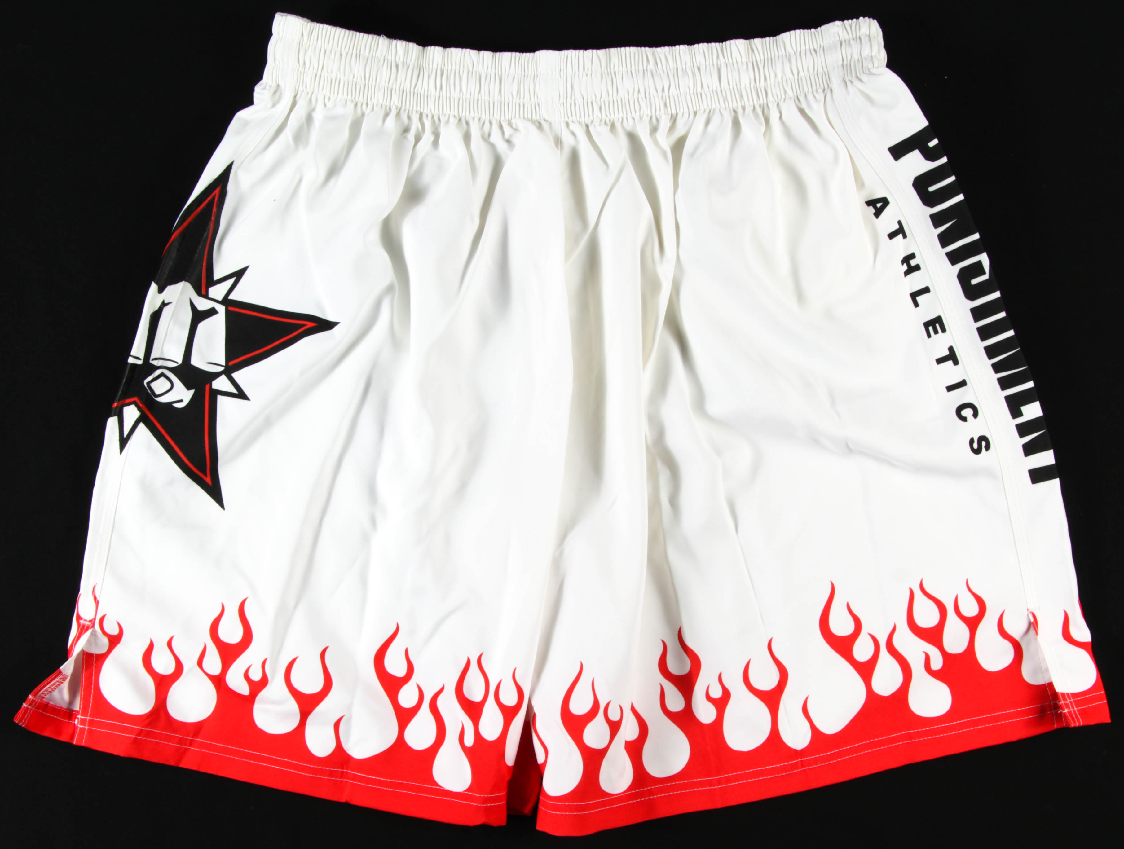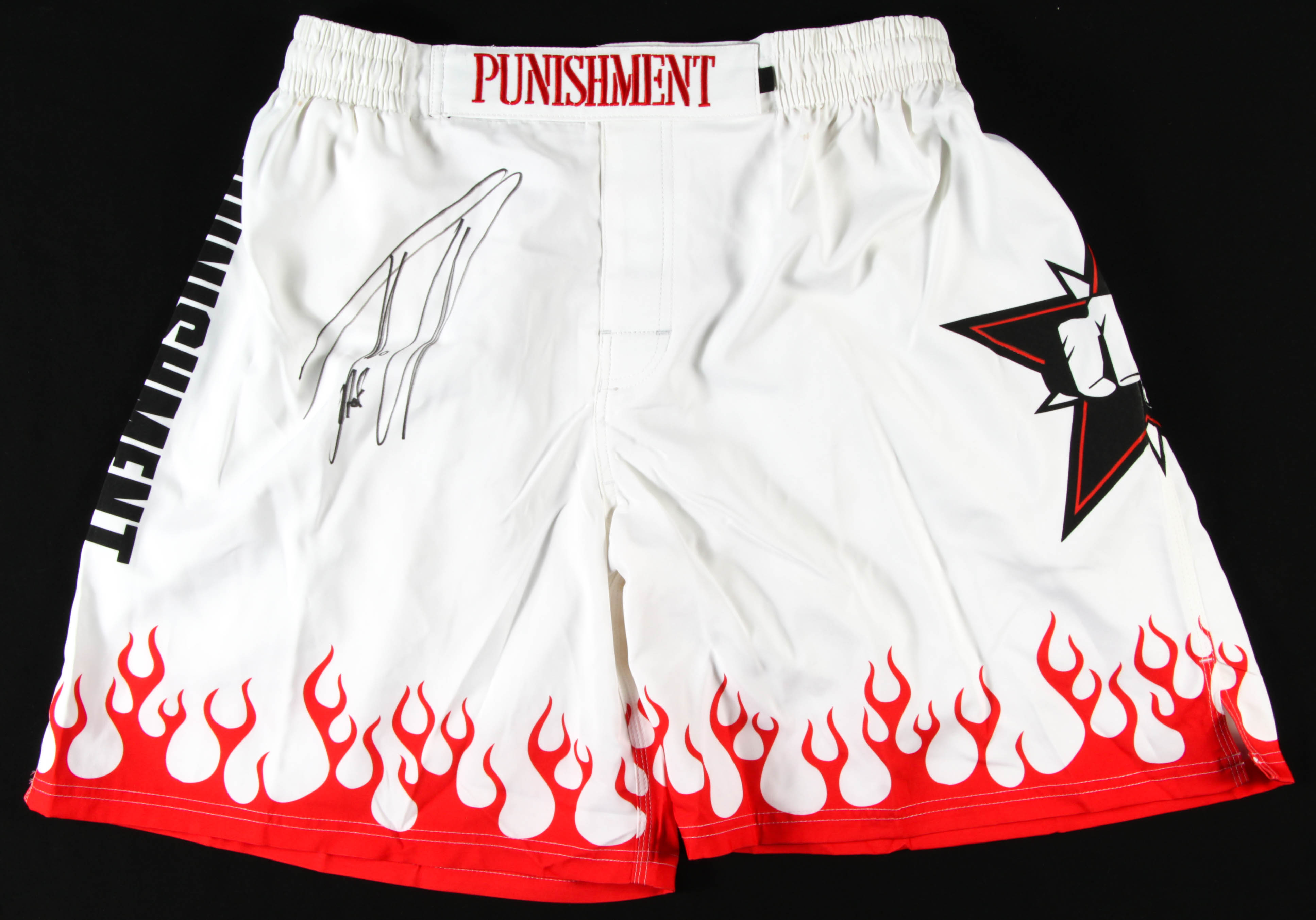 Punishment Athletics boxing shorts, size XL. Hand-signed by Tito Ortiz.