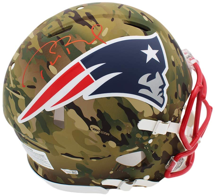 Riddell New England Patriots full-size authentic on-field Camo Alternate speed helmet has been hand-signed by Tom Brady.