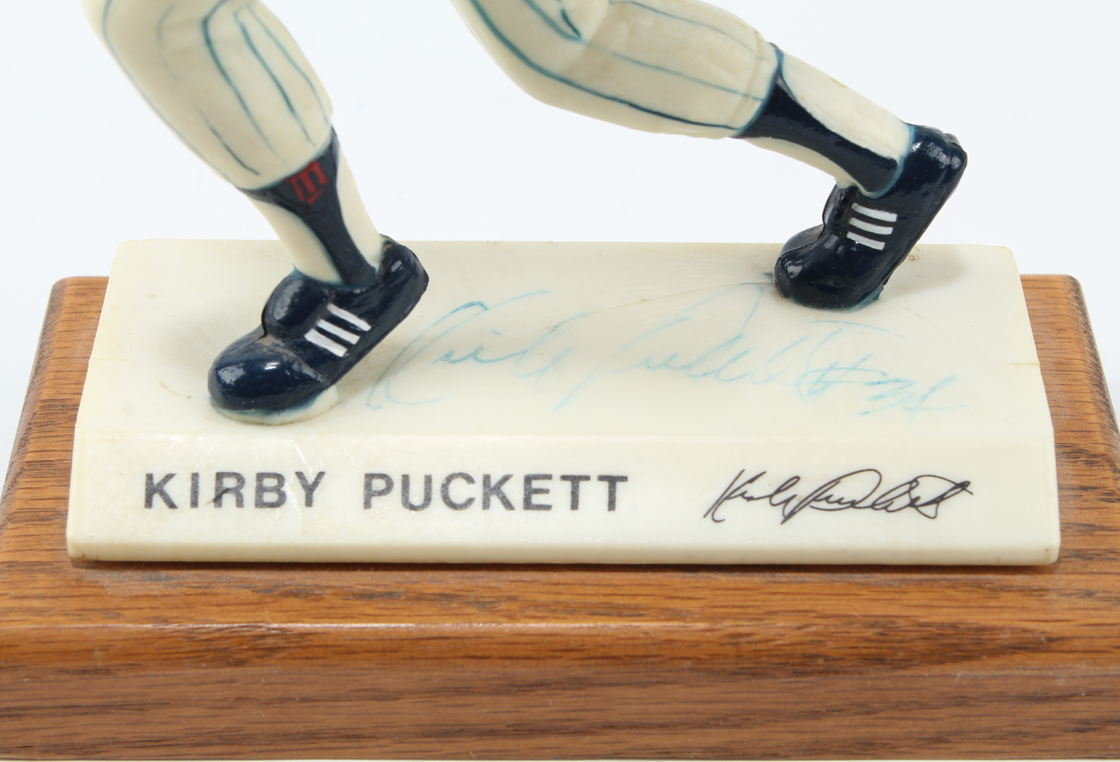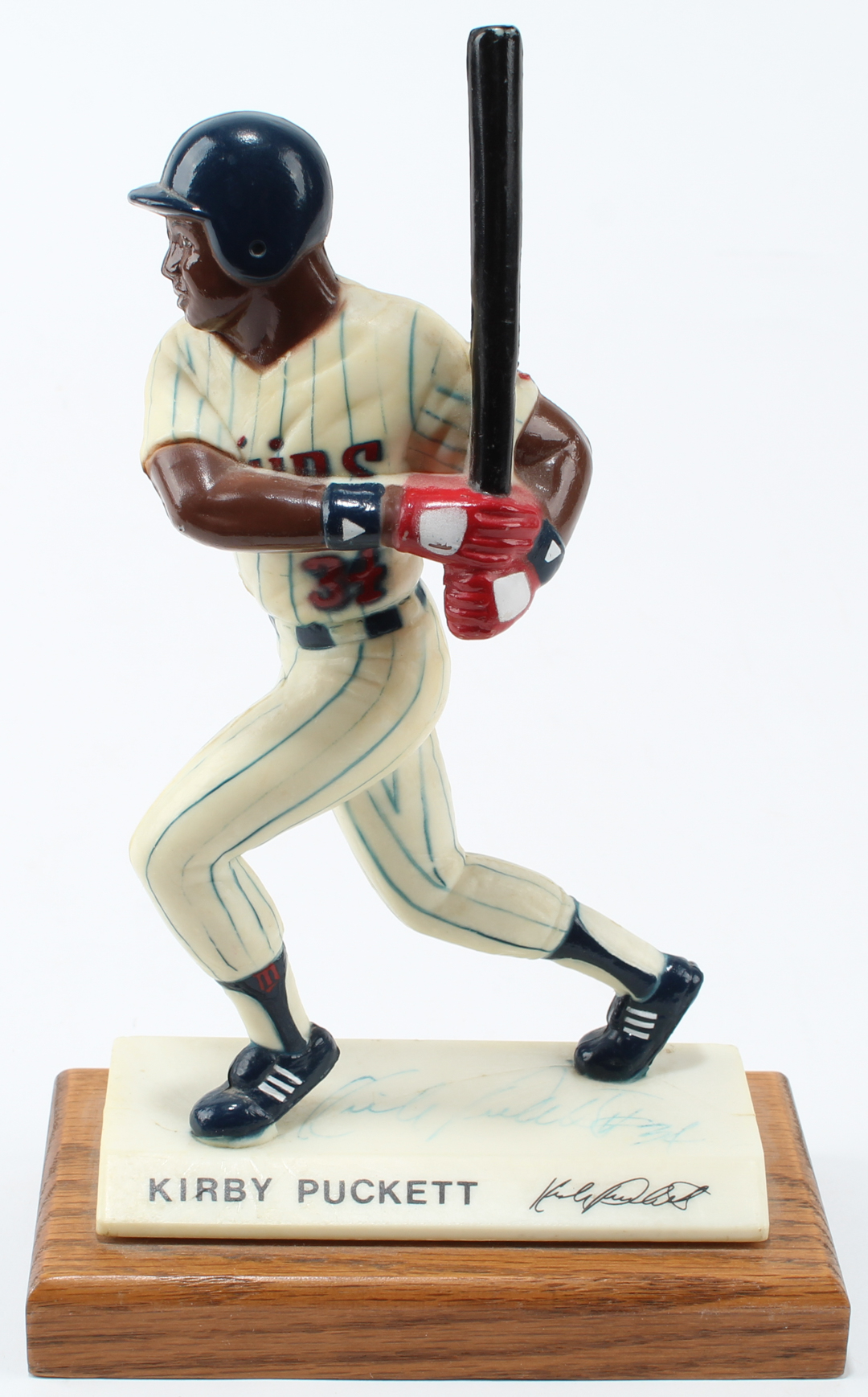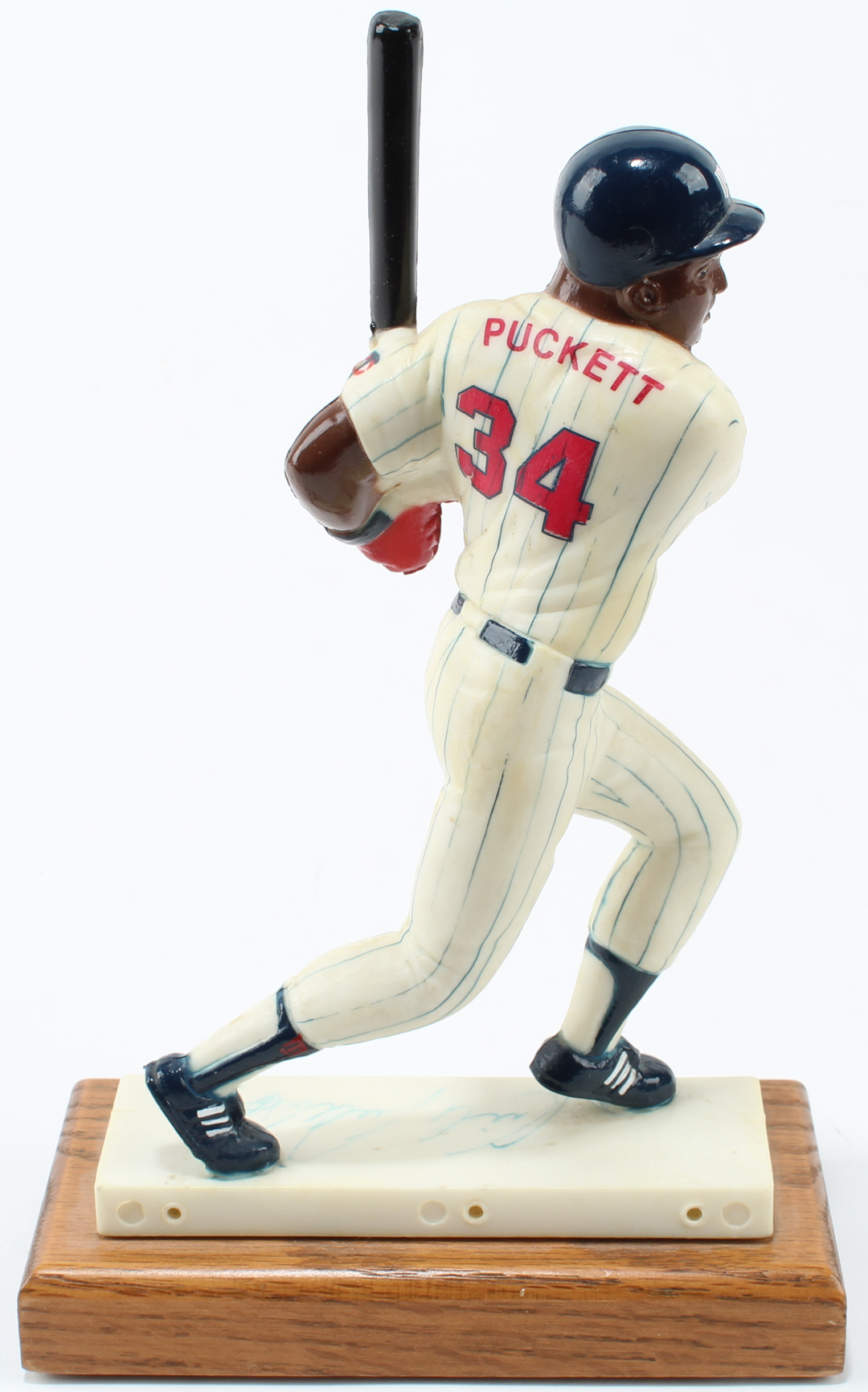 Figurine has been hand-signed on the base plate by Kirby Puckett (D. 2006, Minnesota Twins, HOF). Includes original box as shown.