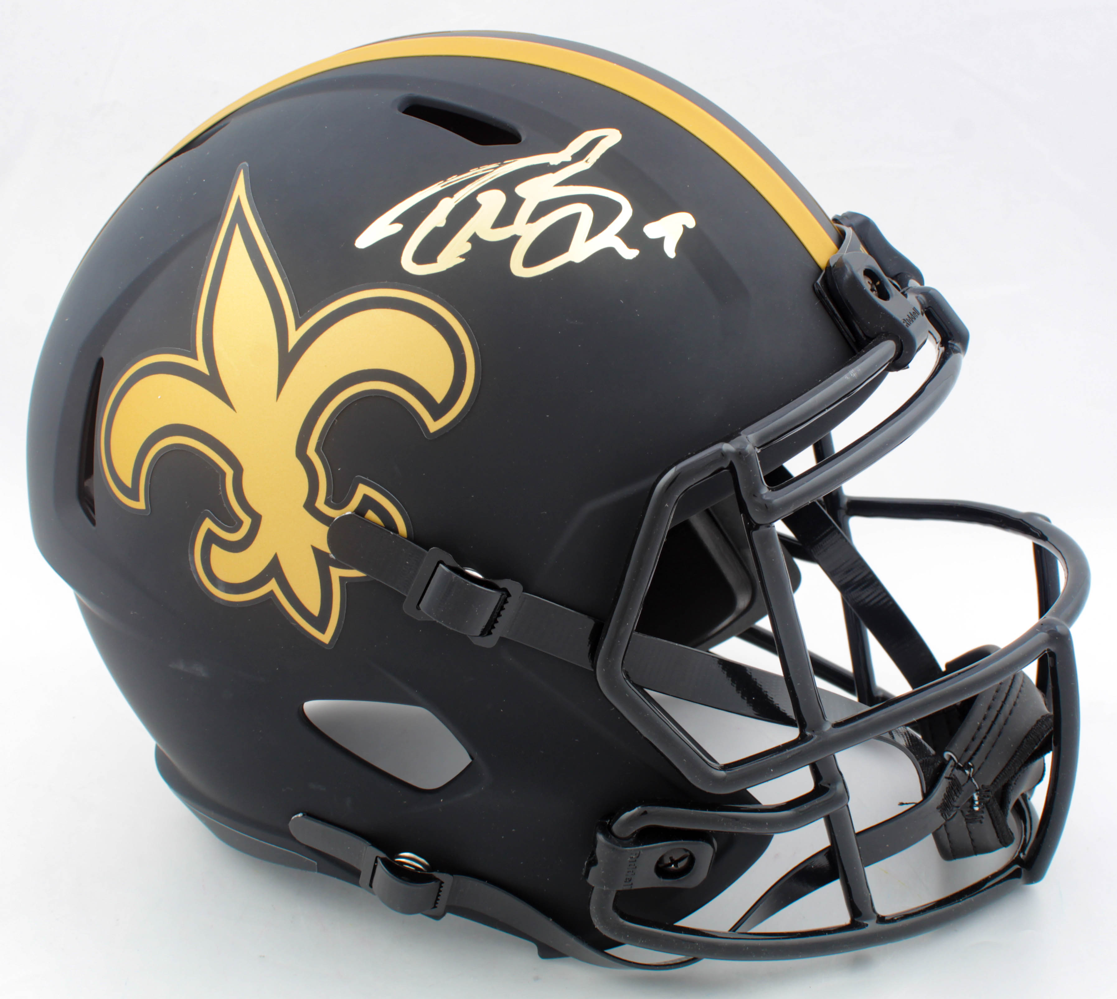 Riddell New Orleans Saints full-size replica Eclipse Alternate speed helmet. Has been hand-signed by Drew Brees.