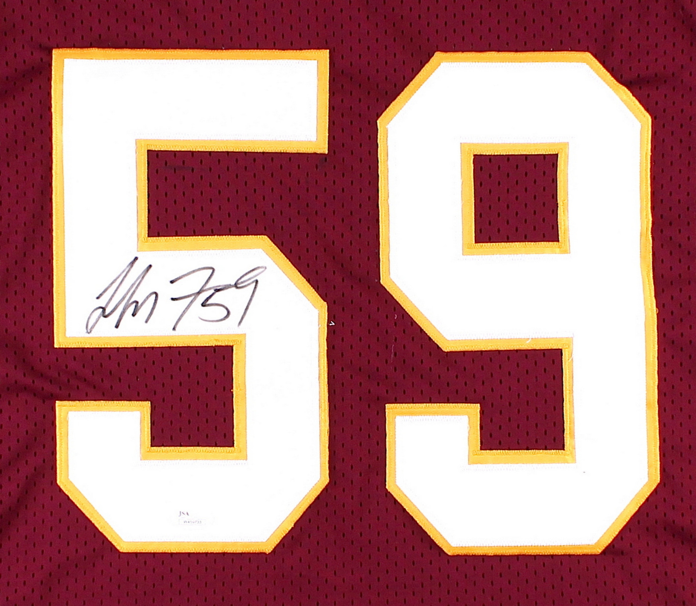 Custom on-field style jersey. Everything sewn on, size XL. Hand-signed in black felt-tip pen by London Fletcher (Rams). The autograph includes an official James Spence Authentication (JSA) hologram and matching COA for authenticity purposes. The signing of this item was witnessed by JSA.