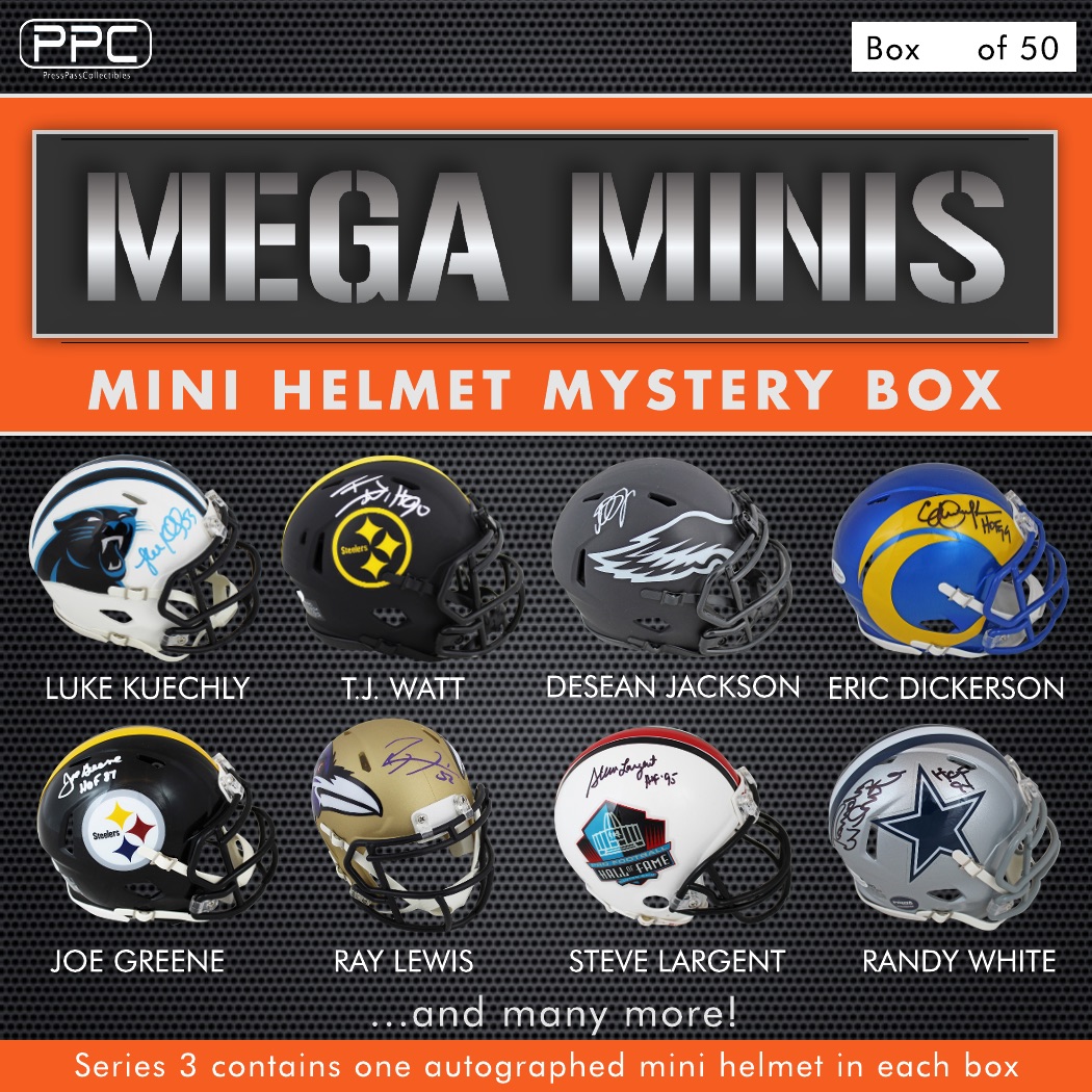 The Press Pass Collectibles 2020 mega mini helmet mystery box includes one (1) mini helmet from your favorite NFL teams. Mega hitboxes will feature mini helmets signed by Steve Largent, Luke Kuechly, Randy White, Joe Greene, and many more! Each item has been authenticated by one of the leading third-party authenticators (PSA/DNA, Beckett, JSA) or will include a player hologram. Players in this series include: