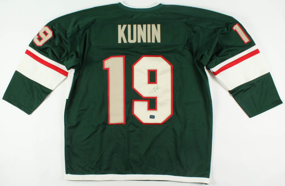 Custom on-ice style jersey. Everything sewn on, size XL. Hand-signed by Luke Kunin.