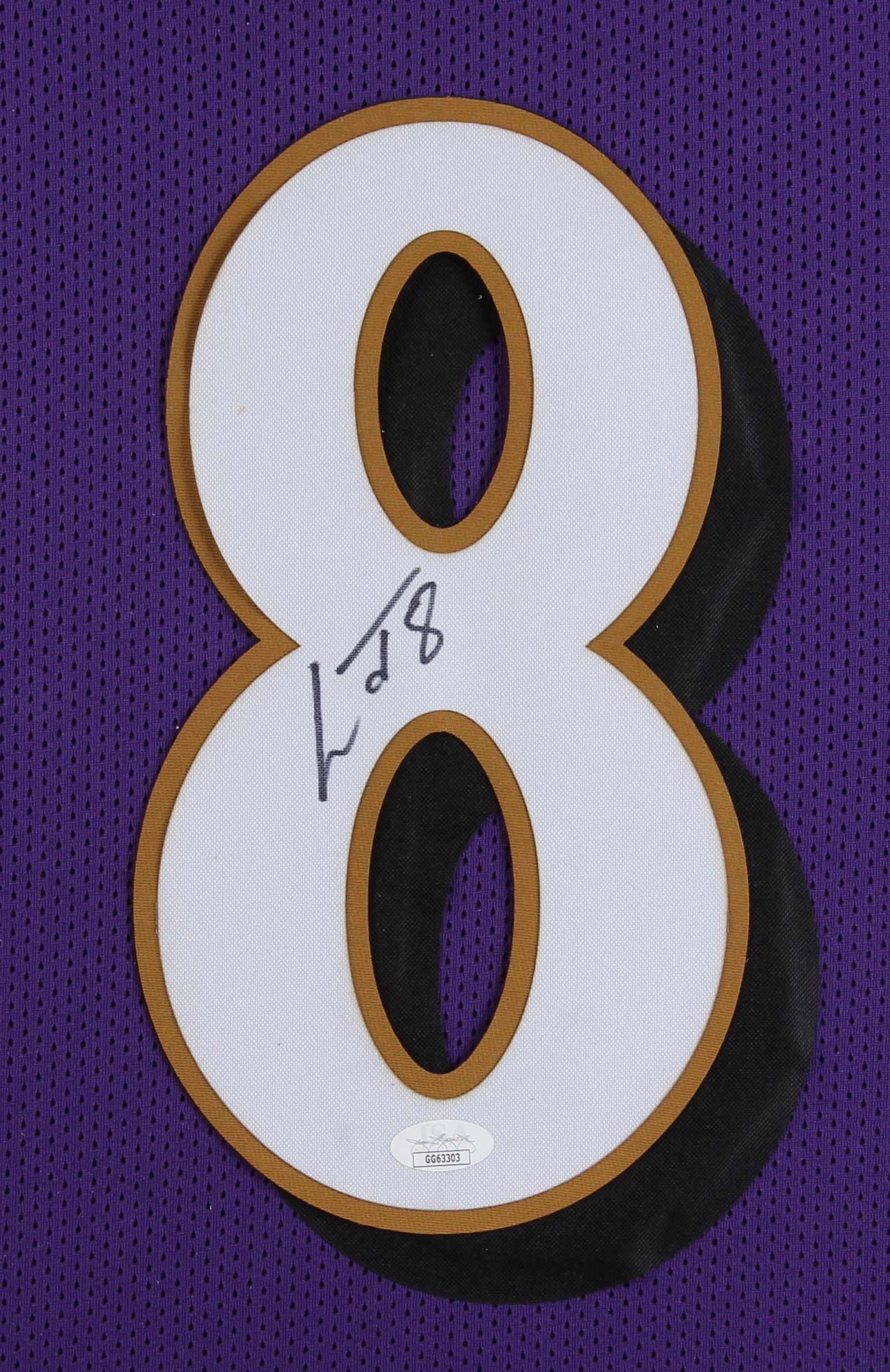 Custom framed display measures 35" x 43" in size and features a jersey that has been hand-signed by Lamar Jackson.