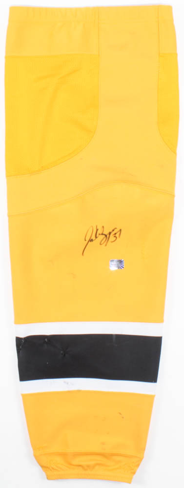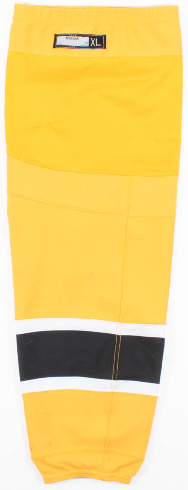 Reebok Hockey on-ice style sock. Everything is sewn on, size XL. The sock has been game-worn and hand-signed by Patrice Bergeron (Boston Bruins). Please see photos for details regarding condition.