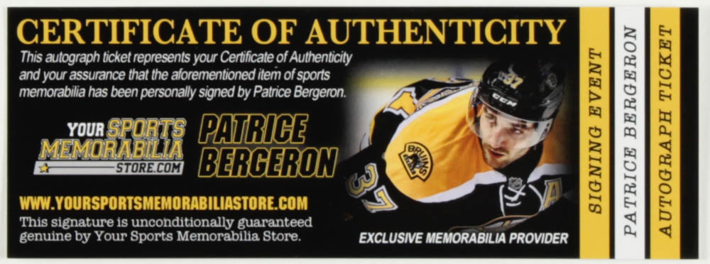 The lot / autograph(s) includes an official Your Sports Memorabilia Store Patrice Bergeron hologram and matching COA for authenticity purposes.