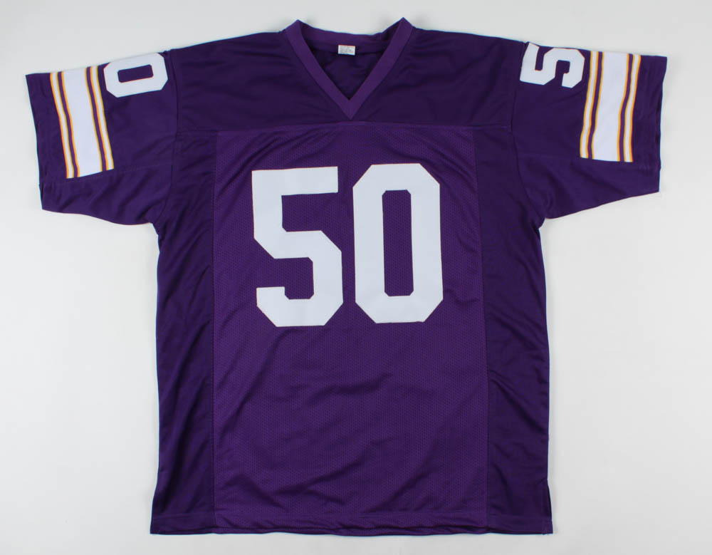 Custom on-field style jersey. Everything is sewn on, size XL. Hand-signed by (4) with Dave Osborn, Scott Studwell, Tim Irwin and Jeff Siemon.