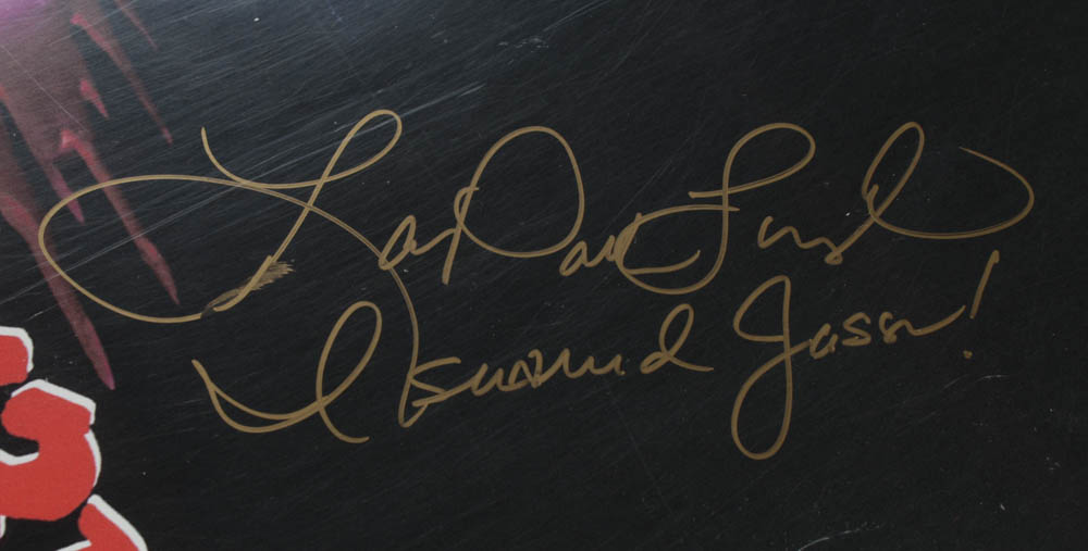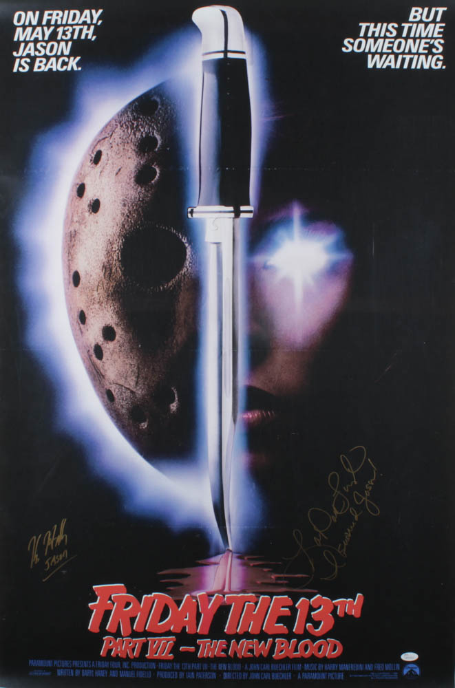 Movie poster measures 27" x 40" in size and has been hand-signed and inscribed by Kane Hodder (Jason) and Lar Park Lincoln (Tina Shepard).
