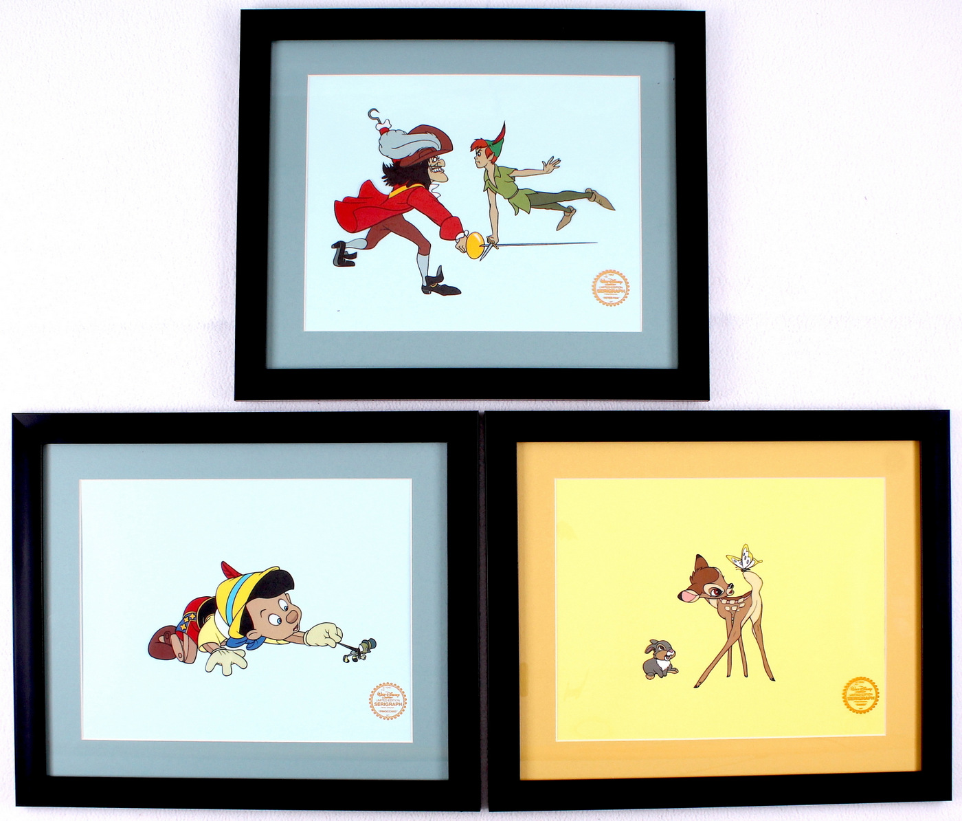 Each custom framed display measures 16" x 19" in size. Features (3) Walt Disney serigraph animation cels from Peter Pan, Bambi & Pinocchio. The serigraph cels are both limited editions. Please see photos for more details.