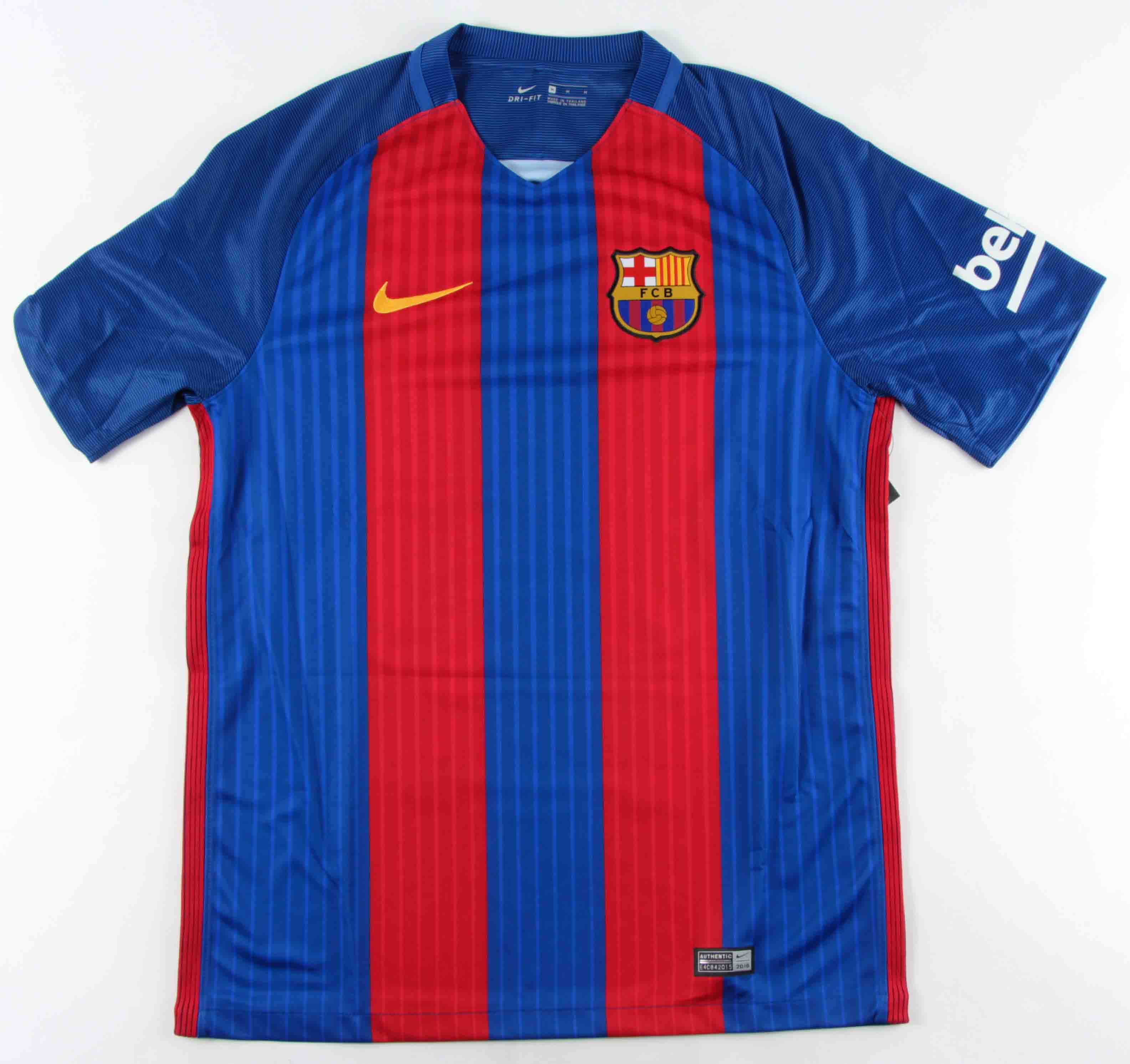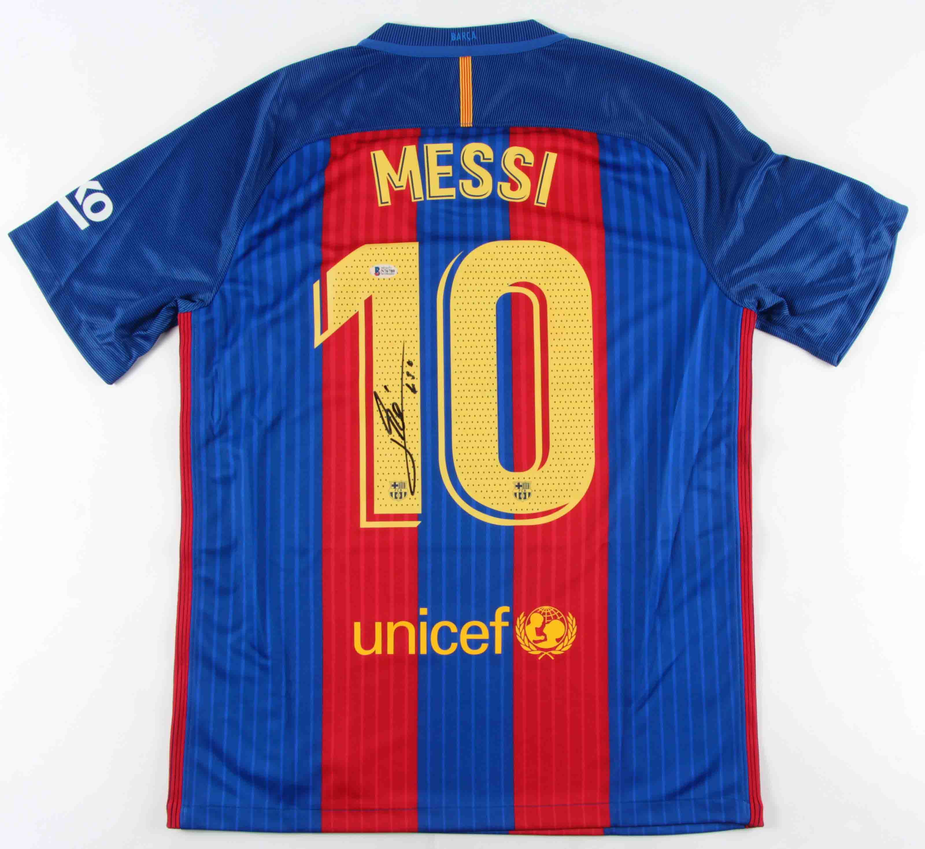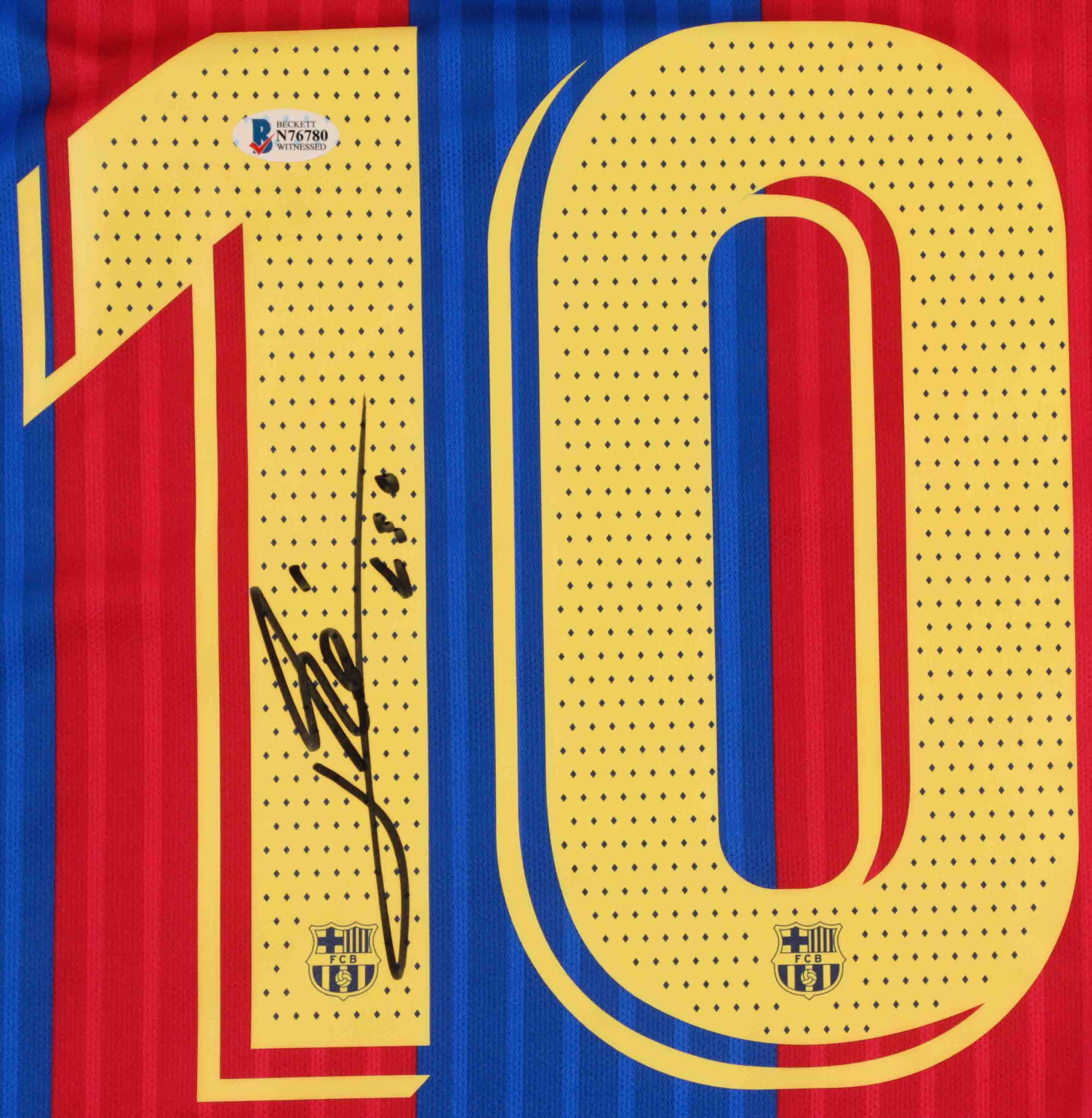 Nike on-field style jersey. Everything printed on, size M. Hand-signed by Lionel Messi.