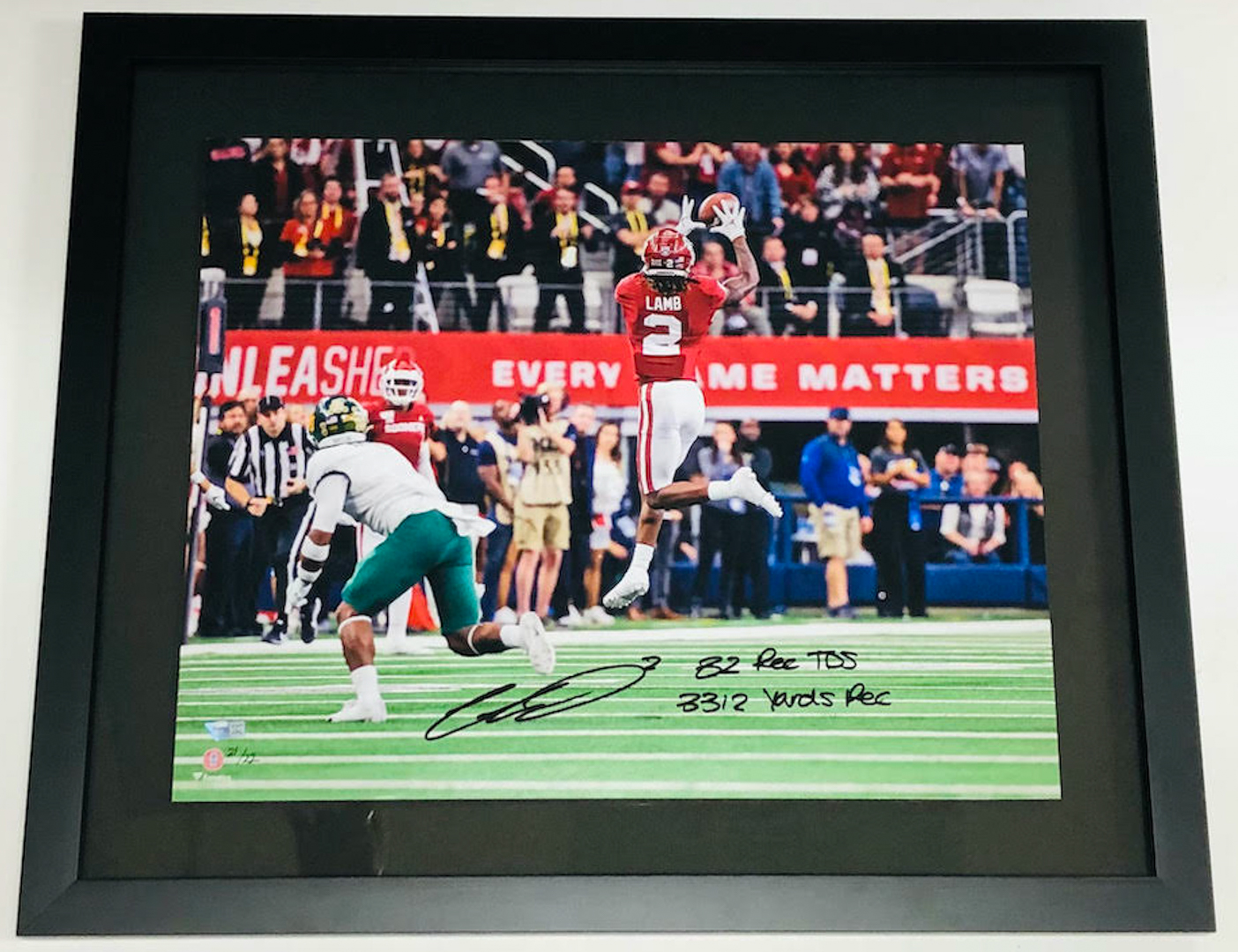 Custom frame measures approximately 20" x 24" in size and features a 16" x 20" photo that has been hand-signed and inscribed by CeeDee Lamb. The photo is a limited edition and has been hand-numbered #/22.