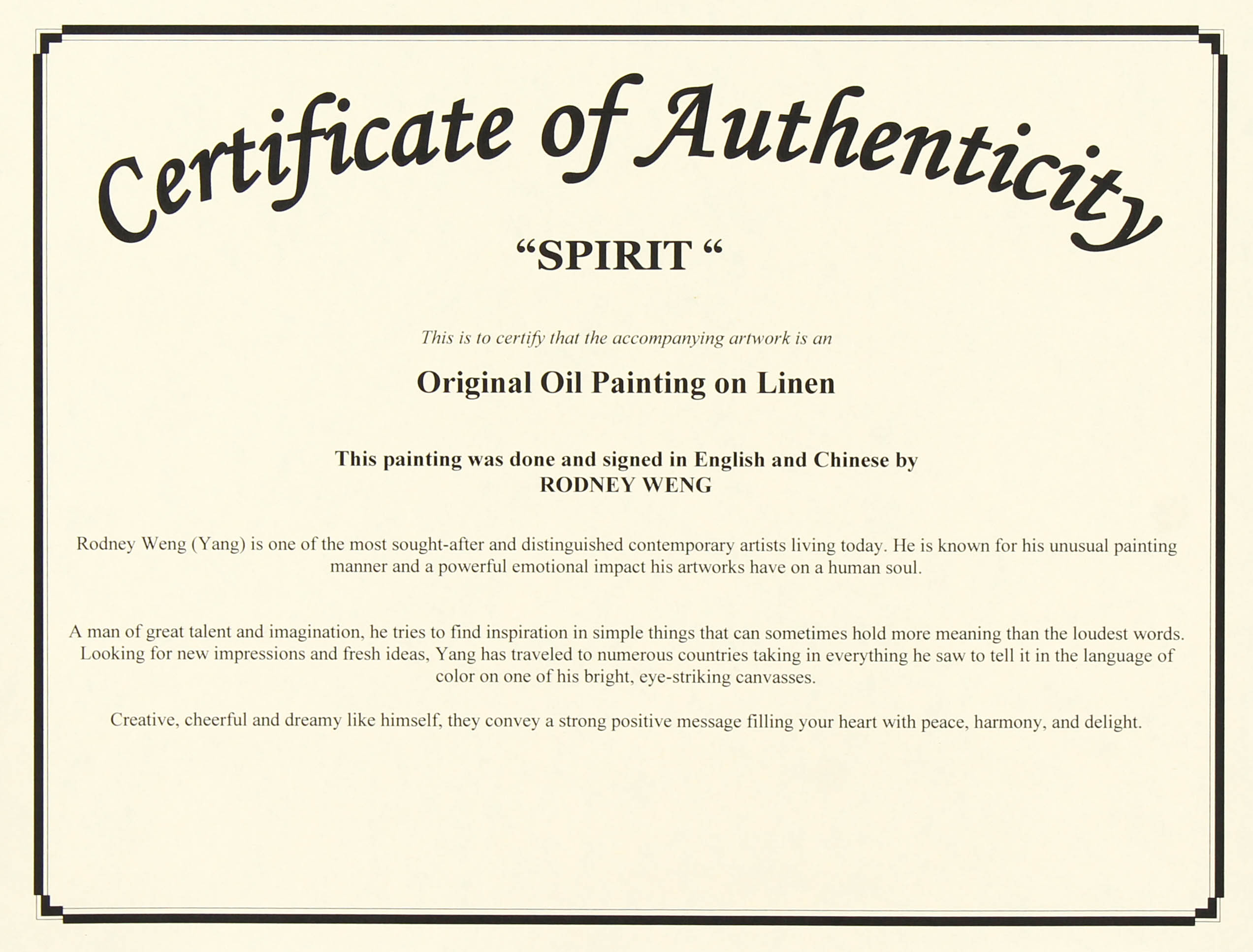 Rodney Weng (Yang) is one of the most sought-after and distinguished contemporary artists living today. He is known for his unusual painting manner and a powerful emotional impact his artworks have on a human soul. Yang captures the emotion and the essence in this original oil painting “SPIRT”. It is hand painted on linen uniquely hand-signed by Rodney Weng (Yang) both in Chinese and English.