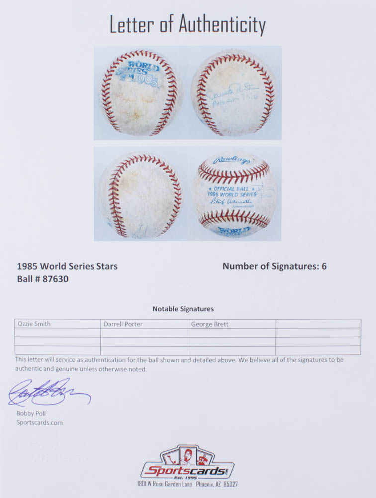 Rawlings Official 1985 World Series baseball. Hand-signed by (6) including Ozzie Smith, Darrell Porter, George Brett and (3) others. Includes display case as shown. Please see images for details regarding the condition of the baseball.