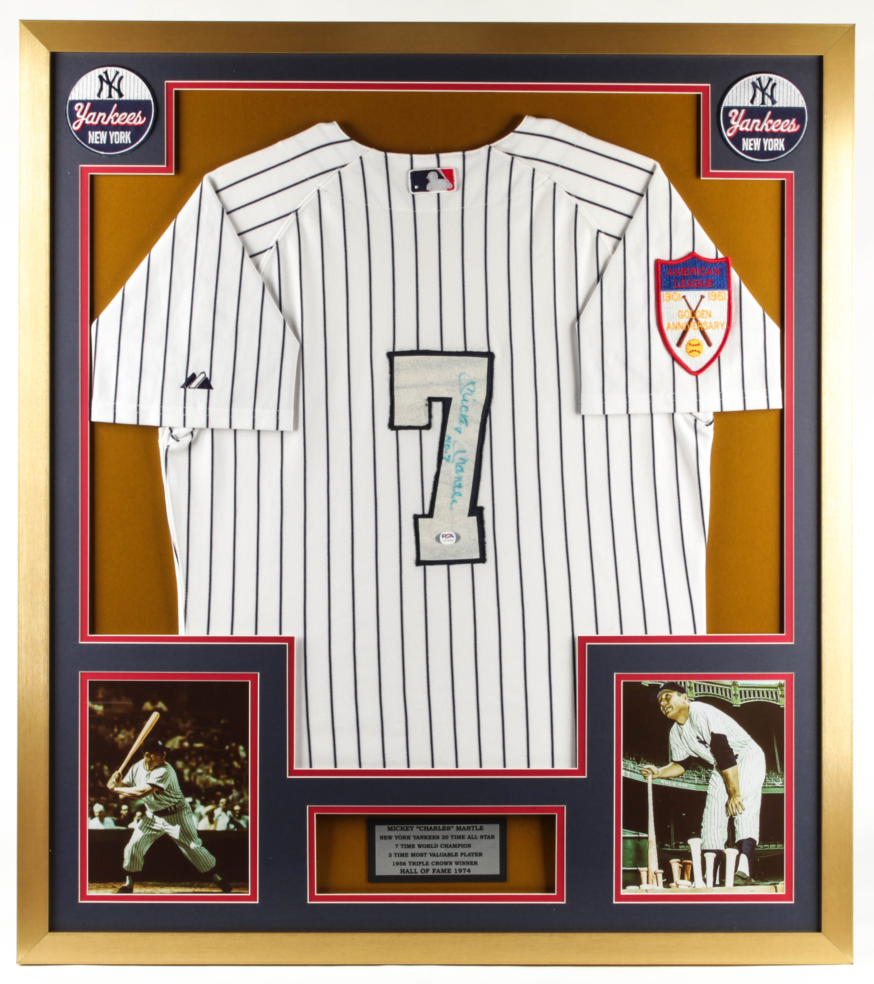 Custom frame jersey display measures 32" x 36" in size and features a jersey that has been hand-signed by Mickey Mantle (D. 1995, New York Yankees, HOF).