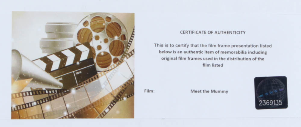 Unique, Original Movie Cell display on an 8” x 10” archival mat board with a photo of the featured film mounted alongside (10) individual, unique film cells from the movie/film. The back mat is cut identically to the front making each cell visible when held to a light. This is a Limited Edition piece and includes a COA detailing the origins of the piece and authenticity.