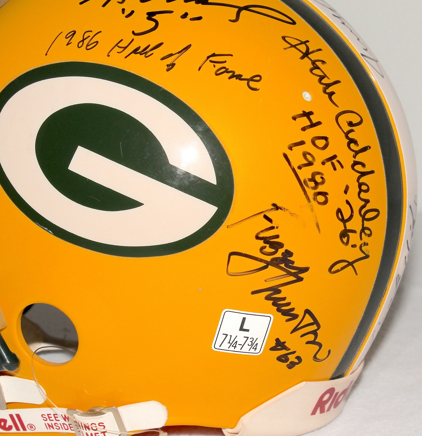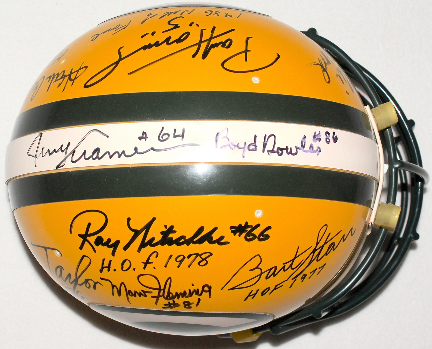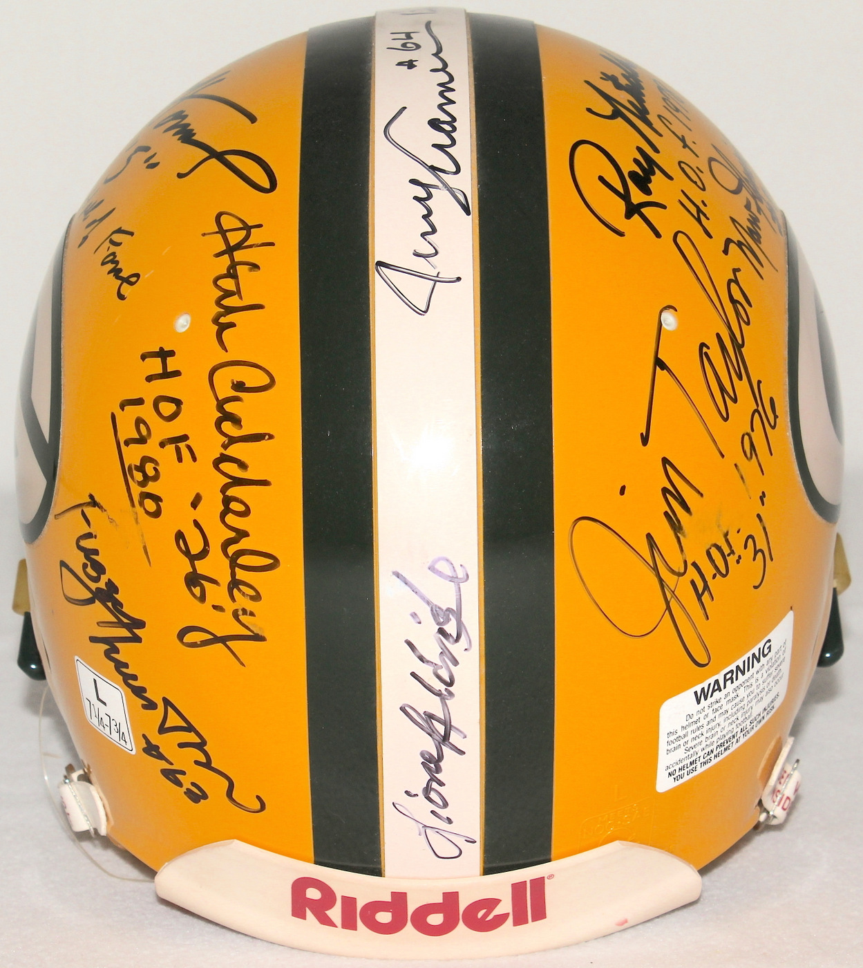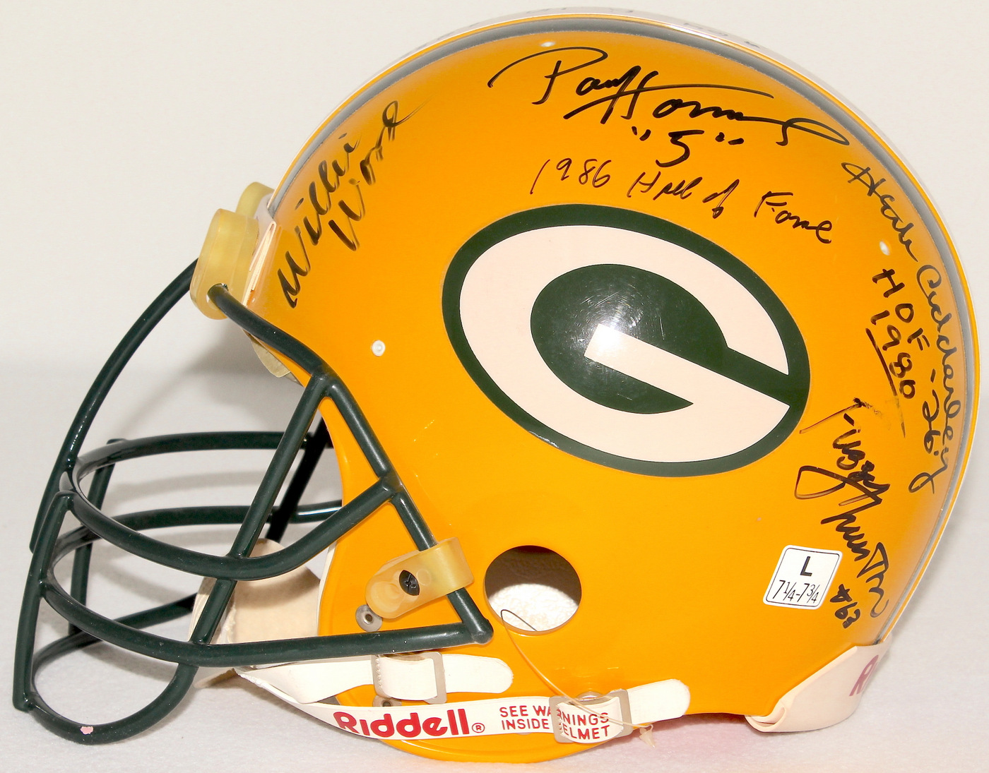 Riddell full-size authentic proline helmet. Hand-signed in black felt-tip pen by Jim Taylor, Ray Nitschke, Bart Starr, Jerry Kramer, Paul Hornung, Willie Wood, Herb Adderley, Marv Fleming, Boyd Dowler, Fred "Fuzzy" Thurston and Lionel Aldridge. Note, inscriptions have been penned by an unknown person rather than the players themselves. A few of the signatures are very slightly smudged, please see photos for details. The autographs include a James Spence Authentication (JSA) Auction House LOA for authenticity purposes.