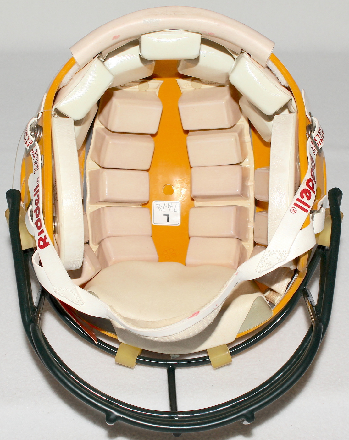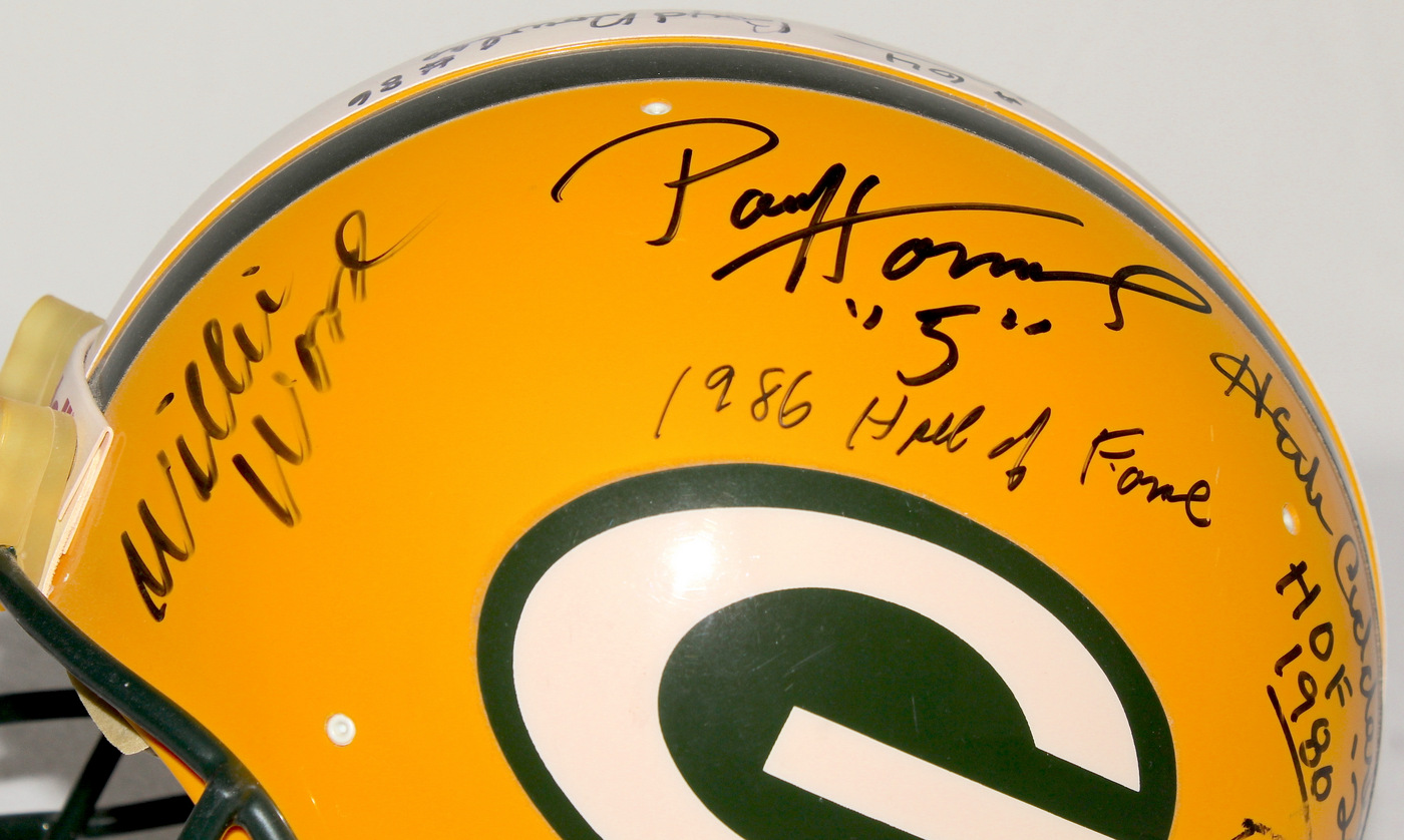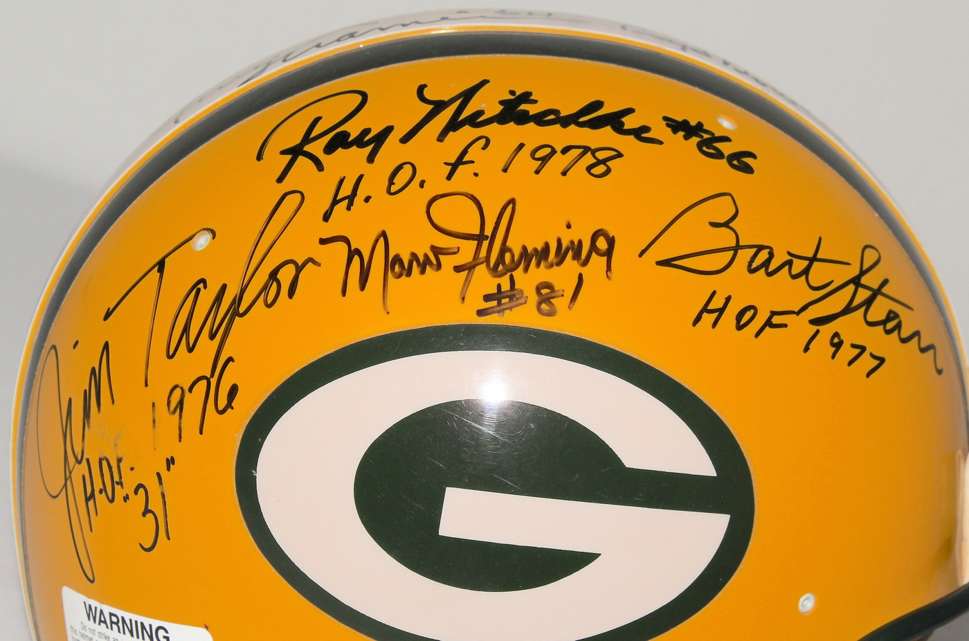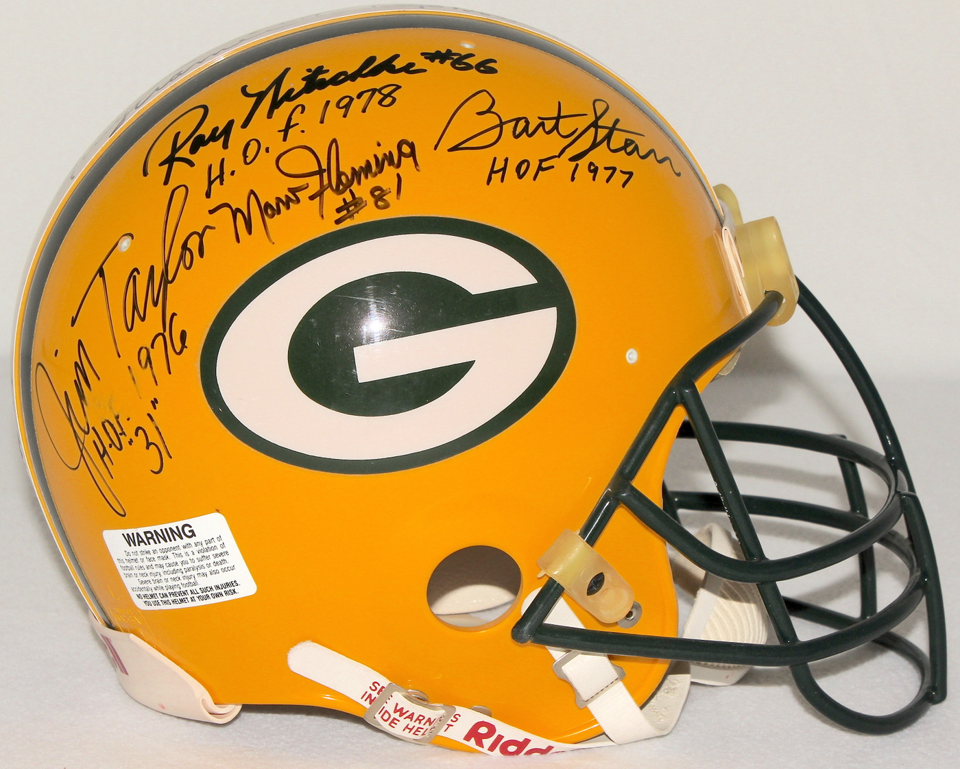 Riddell full-size authentic proline helmet. Hand-signed in black felt-tip pen by Jim Taylor, Ray Nitschke, Bart Starr, Jerry Kramer, Paul Hornung, Willie Wood, Herb Adderley, Marv Fleming, Boyd Dowler, Fred "Fuzzy" Thurston and Lionel Aldridge. Note, inscriptions have been penned by an unknown person rather than the players themselves. A few of the signatures are very slightly smudged, please see photos for details. The autographs include a James Spence Authentication (JSA) Auction House LOA for authenticity purposes.