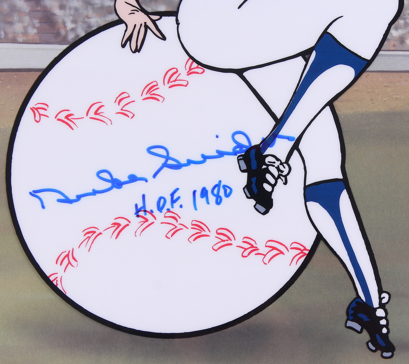 Custom matted sericel display measures 12" x 16" in size. Hand-signed in blue felt-tip pen by Duke Snider (D 2011, Dodgers HOF). The autograph includes an official James Spence Authentication (JSA) hologram and matching COA for authenticity purposes.
