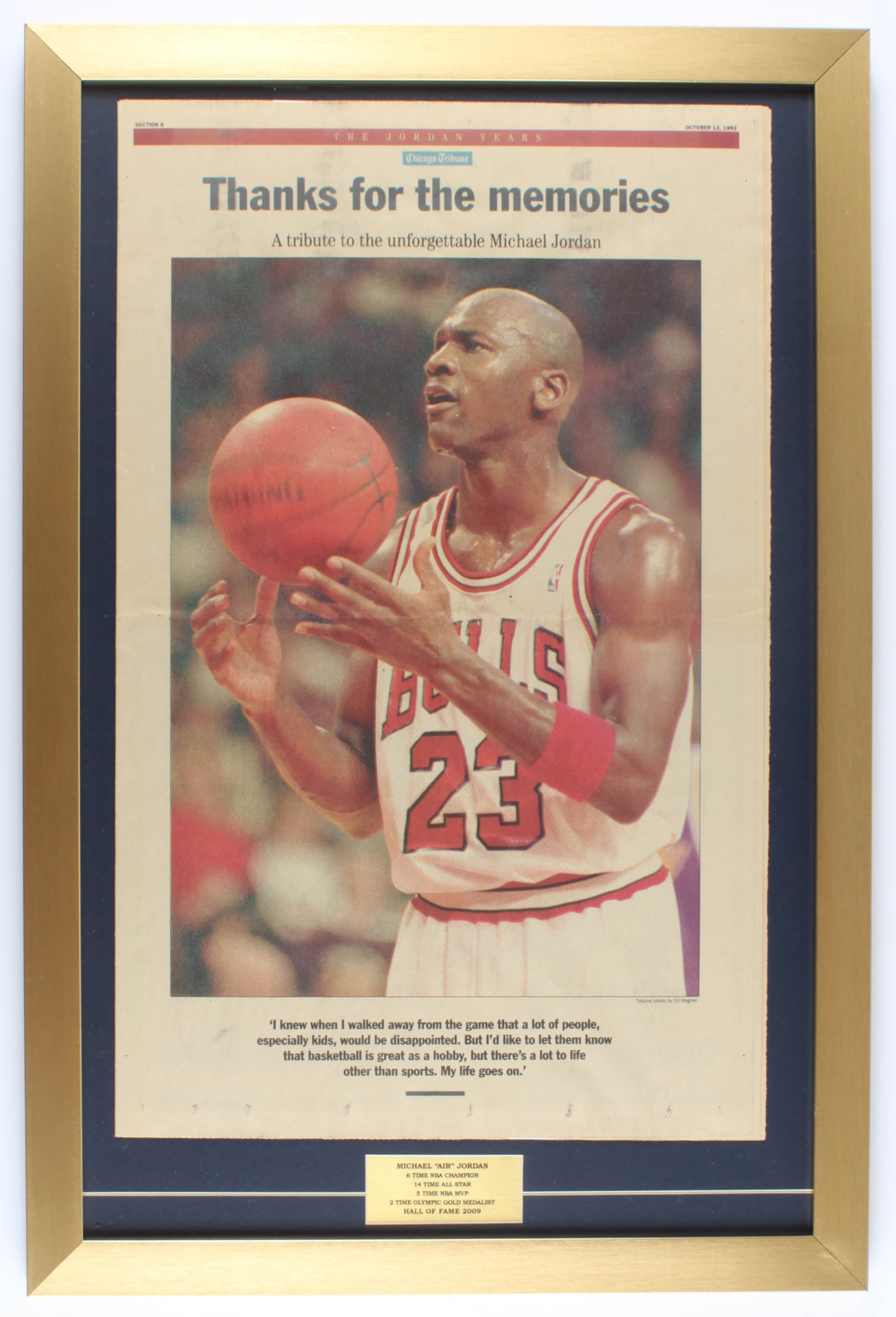 Custom framed display measures approximately 18" x 27" in size and features a full Chicago Tribune newspaper that dates October 13, 1993. Please note, display is unsigned. See images for details regarding the condition.