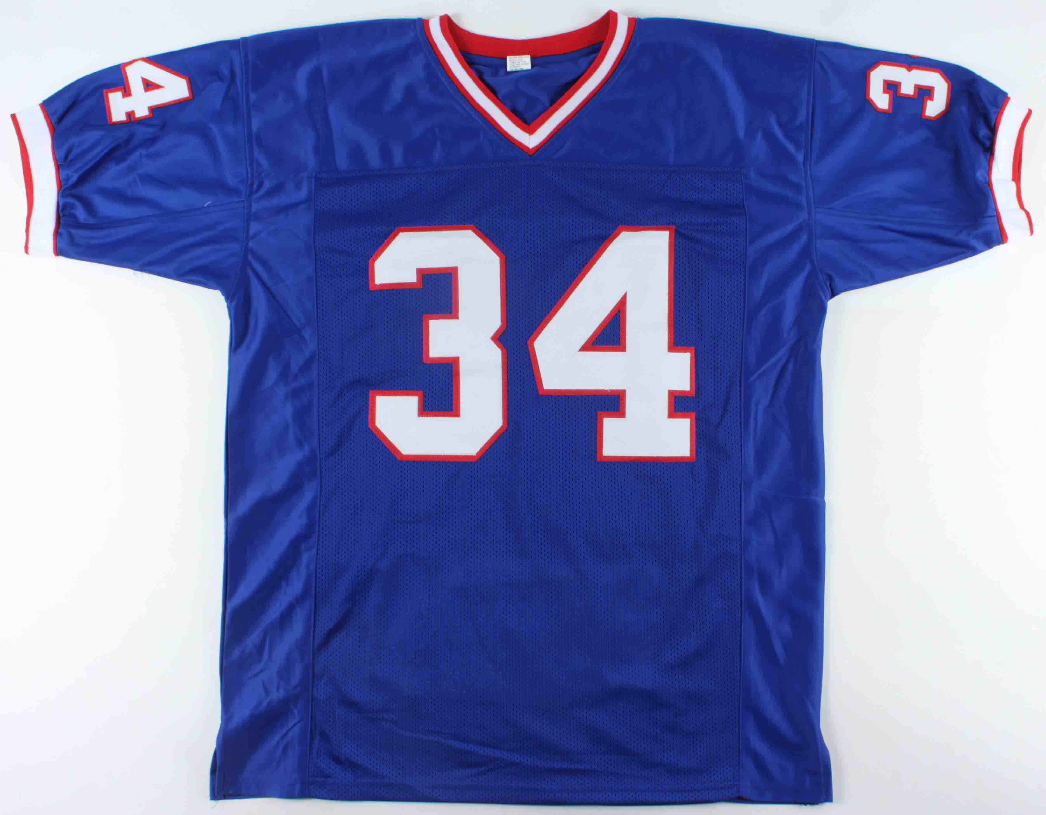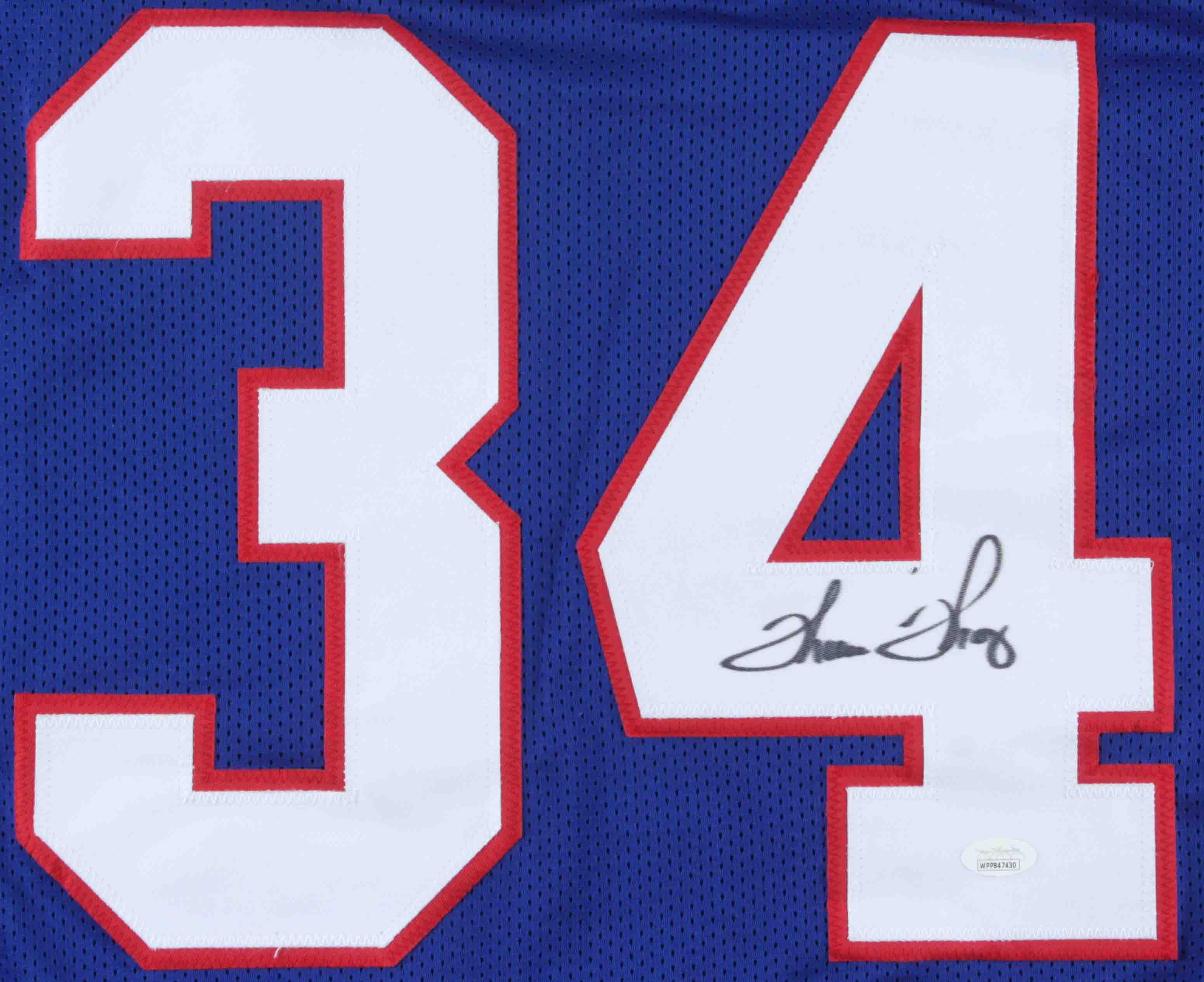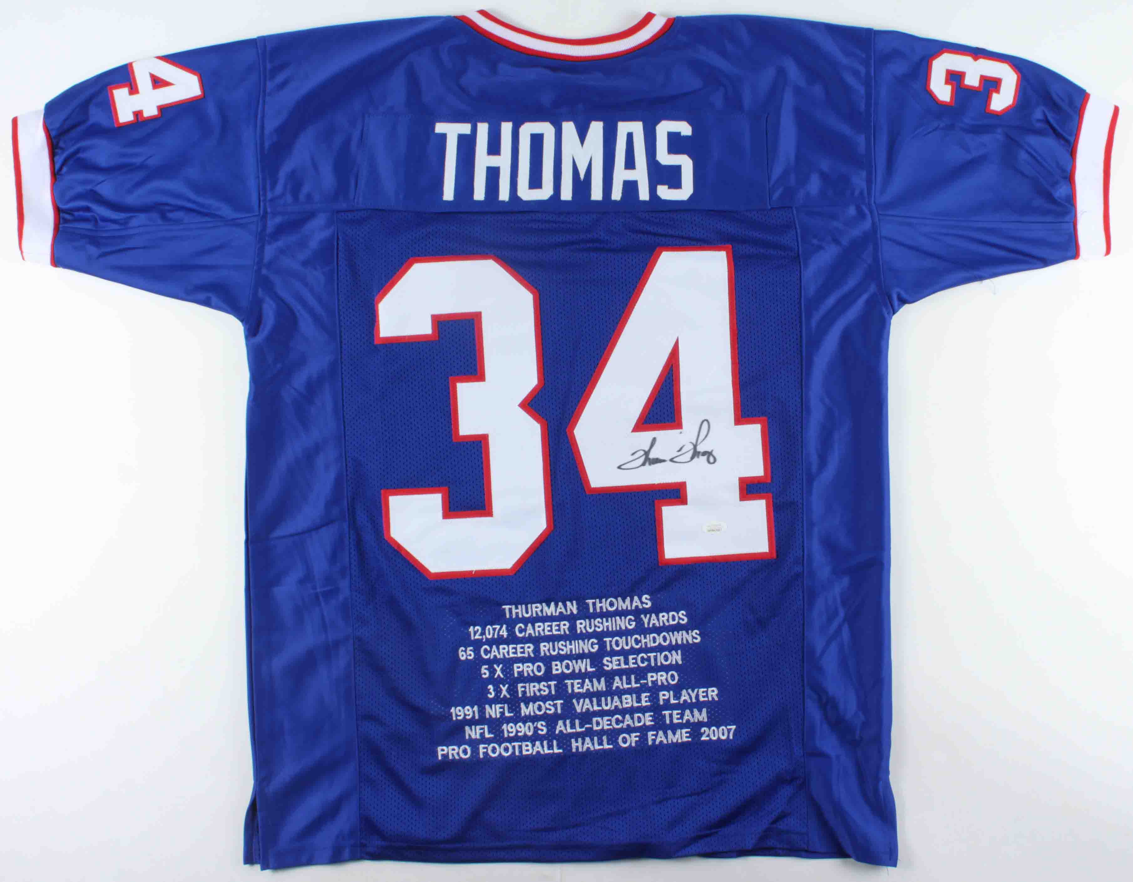 Custom on-field style jersey. Everything is sewn on, size XL. Has been hand-signed by Thurman Thomas (HOF). Thomas' career highlights have been custom stitched onto the back of the jersey below the reverse numbers.