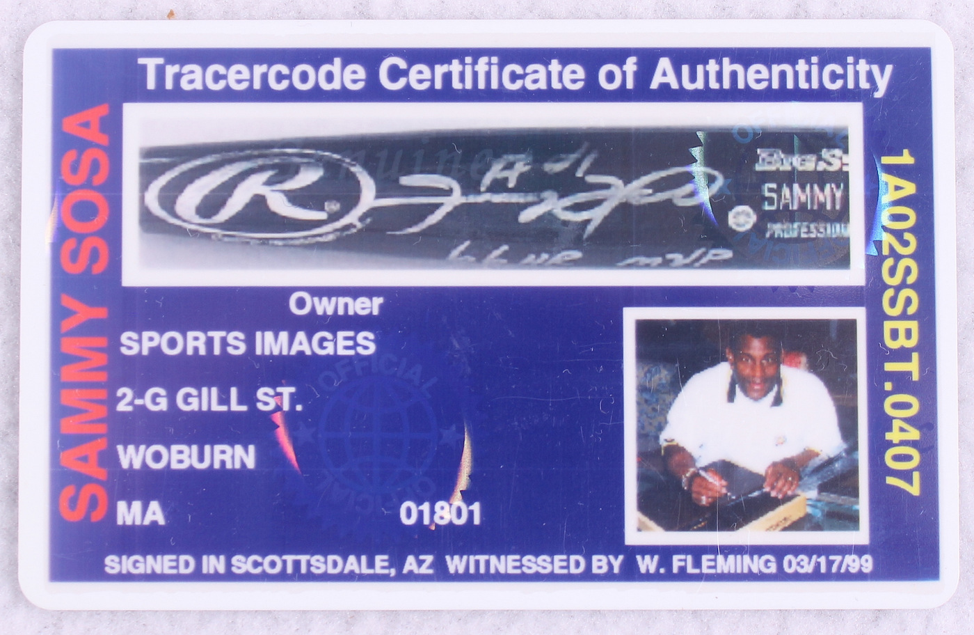 Full-size custom engraved Rawlings big stick bat. Hand-signed and inscribed in silver paint pen by Sammy Sosa (Cubs). The autograph includes an official Total Sports Concepts hologram and matching COA for authenticity purposes.