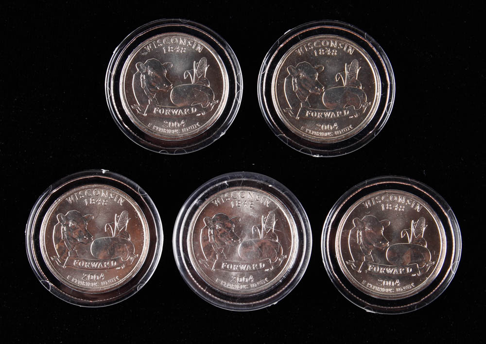 Complete Set of (5) Green Bay Packers NFL Colorized Commemorative Wisconsin State Quarters with Brett Favre
