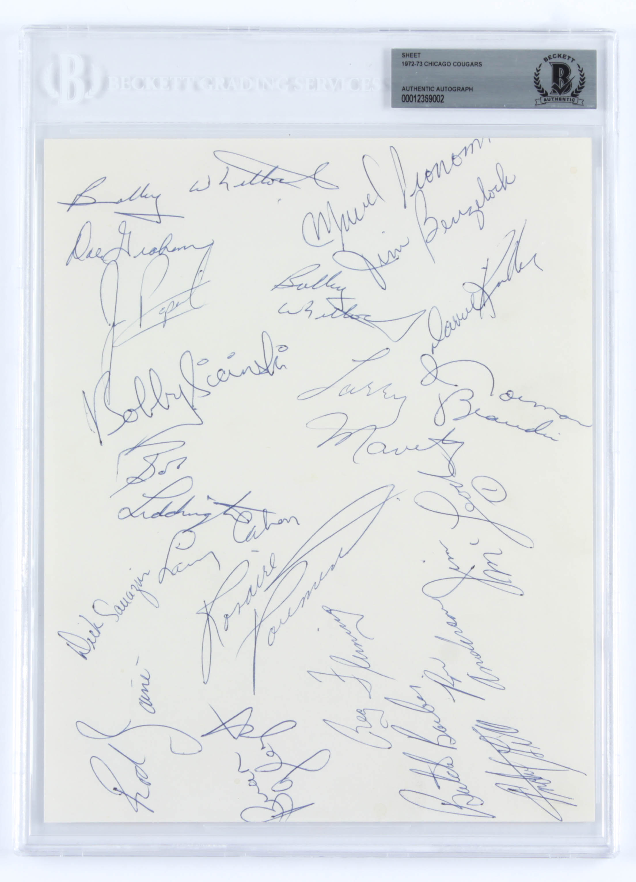 1972-73 Chicago Cougars 8.5x11 Page Team-Signed by (19) with Marcel Pronovost, Jim McLeod, Ron Anderson, Larry Cahan, Reg Fleming (BGS Encapsulated)