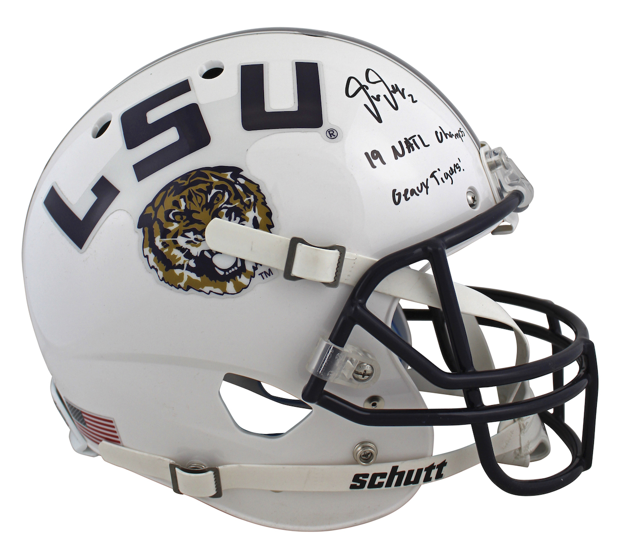 Schutt LSU Tigers full-size replica helmet. Has been hand-signed by Justin Jefferson.