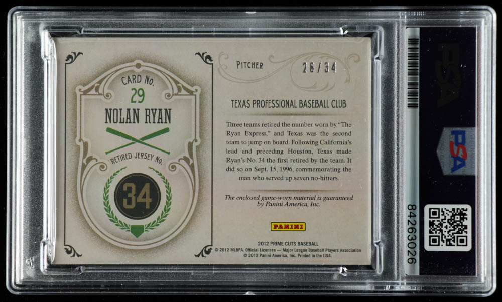 Nolan Ryan Signed 2012 Prime Cuts Retired Jersey Numbers #29 SE #26/34 (PSA Encapsulated)