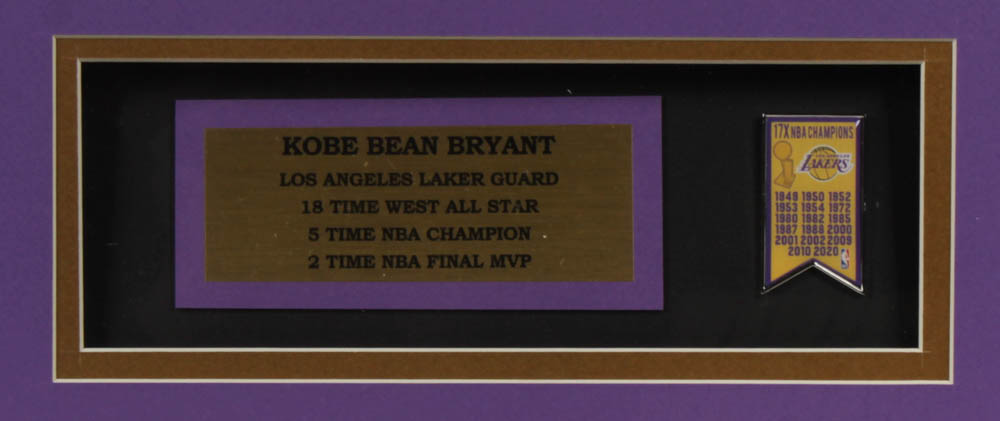 Custom frame measures 32" x 36" in size and features a jersey of Kobe Bryant (D. 2020, Los Angeles Lakers, HOF). Display also features a Los Angeles Lakers Championships Banner pin. Please note, the display is unsigned.