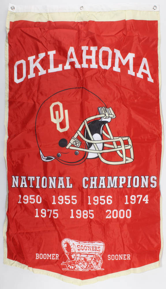 Oklahoma Sooners National Champions flag measures approximately 30" x 53" in size. Please see images for details regarding the condition of the banner.